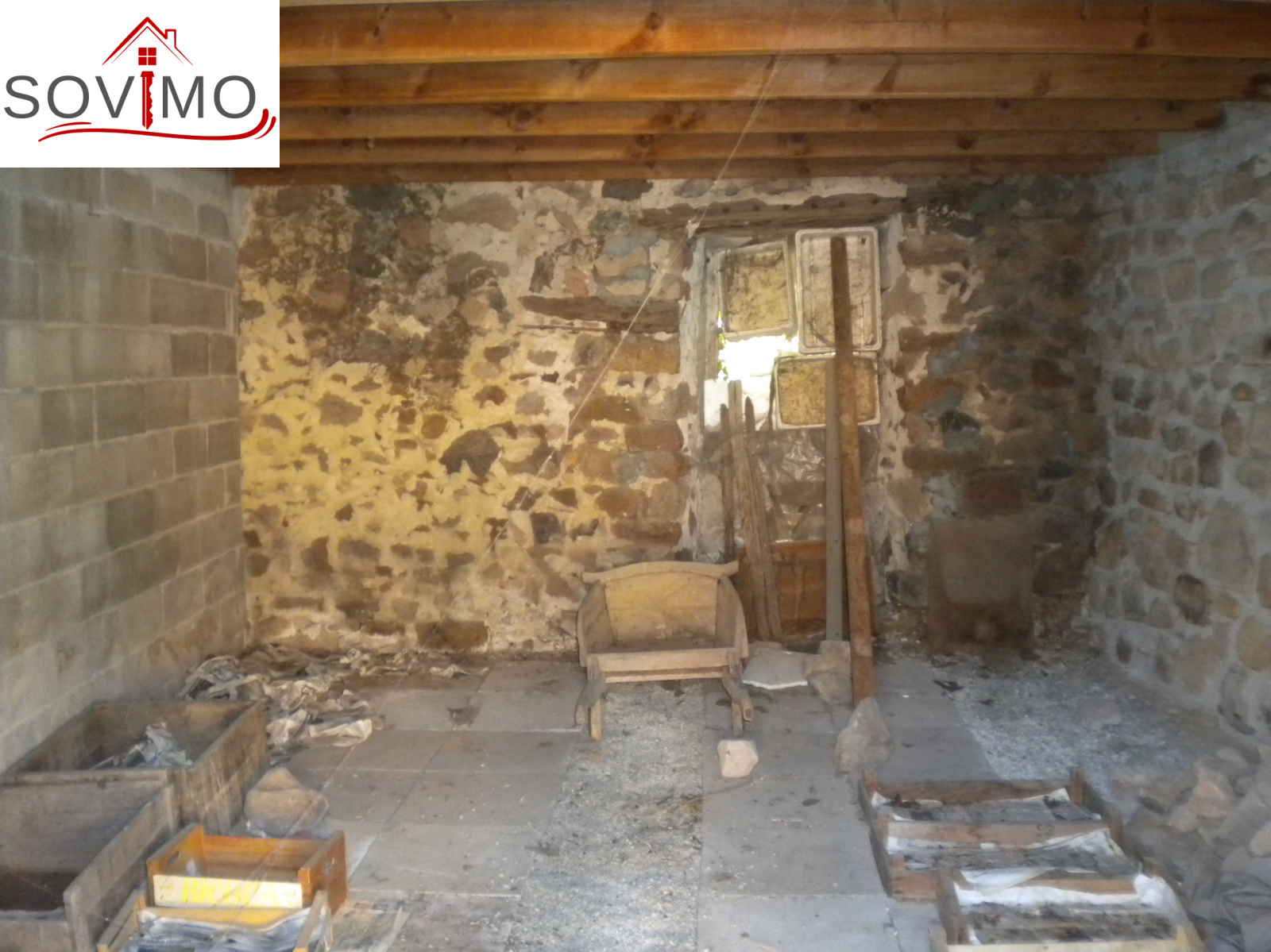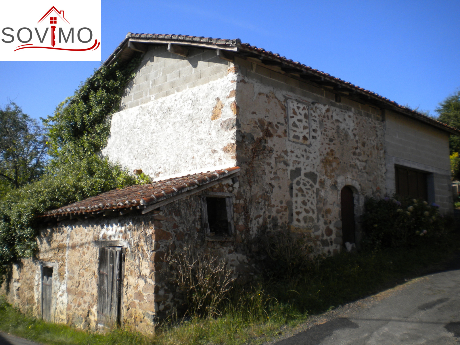 Bâtiment indépendant avec garage 22 m2 et grenier au dessus, débarras et petits toits, 2 puits.