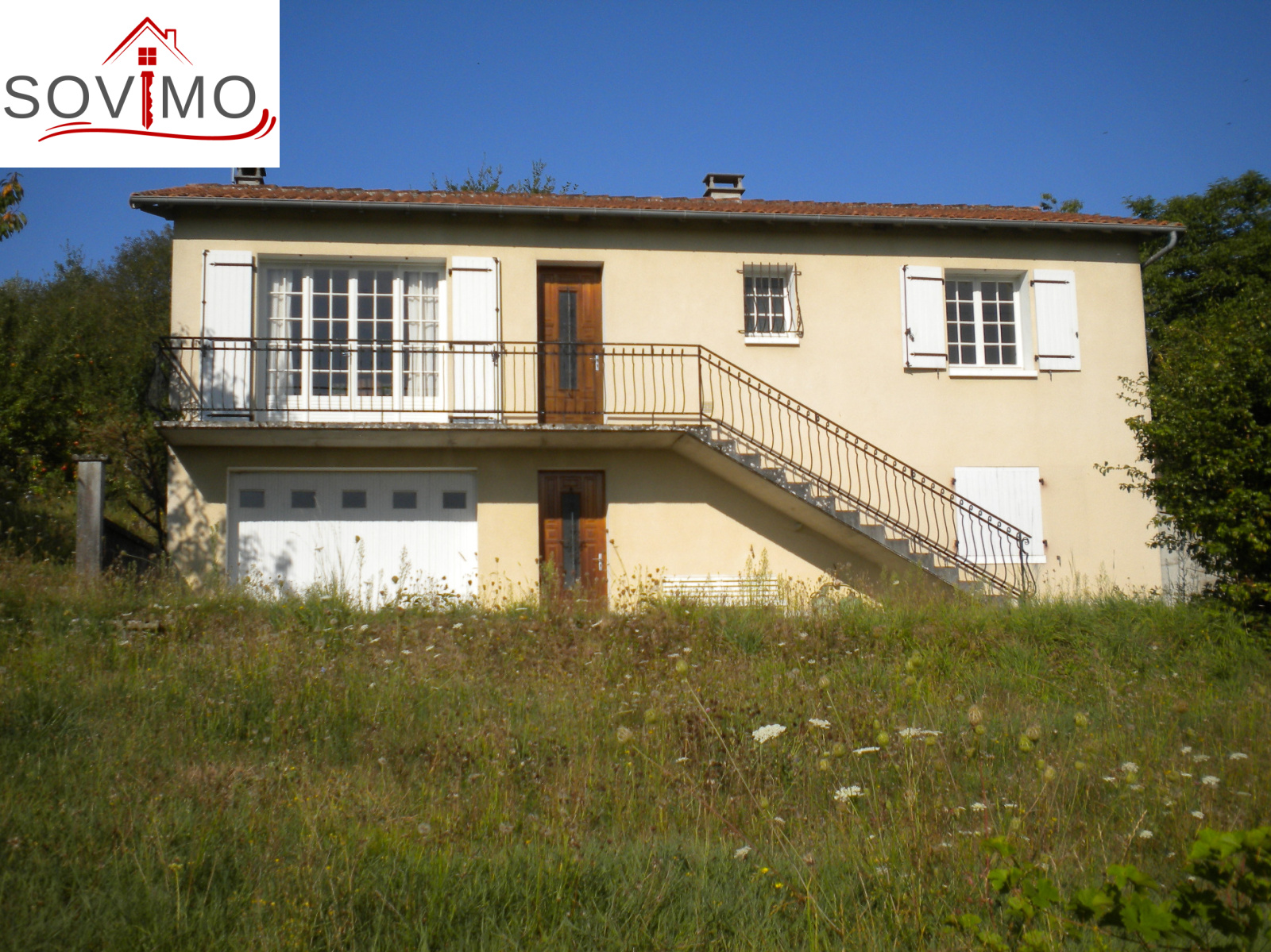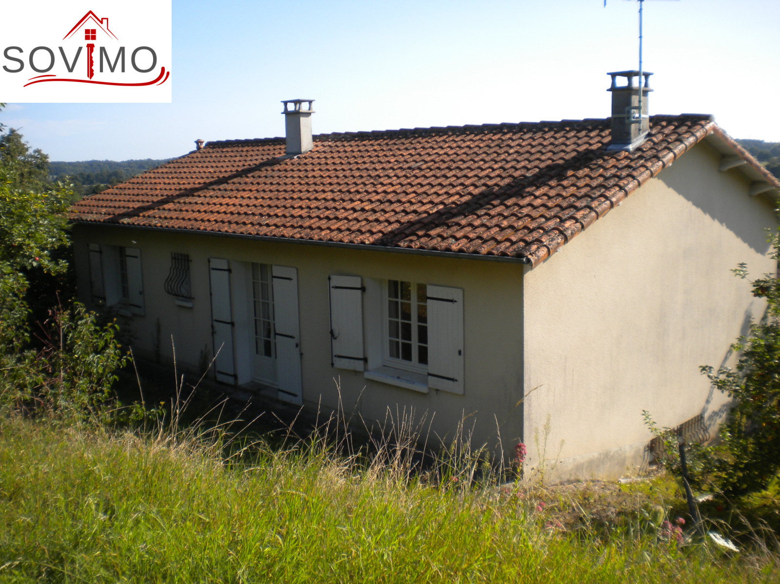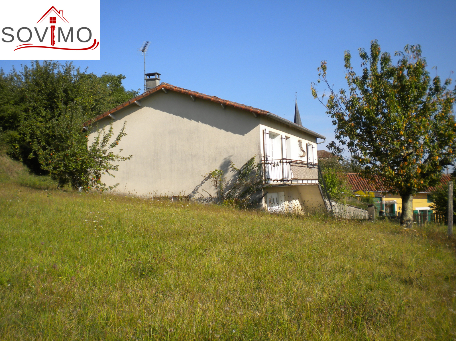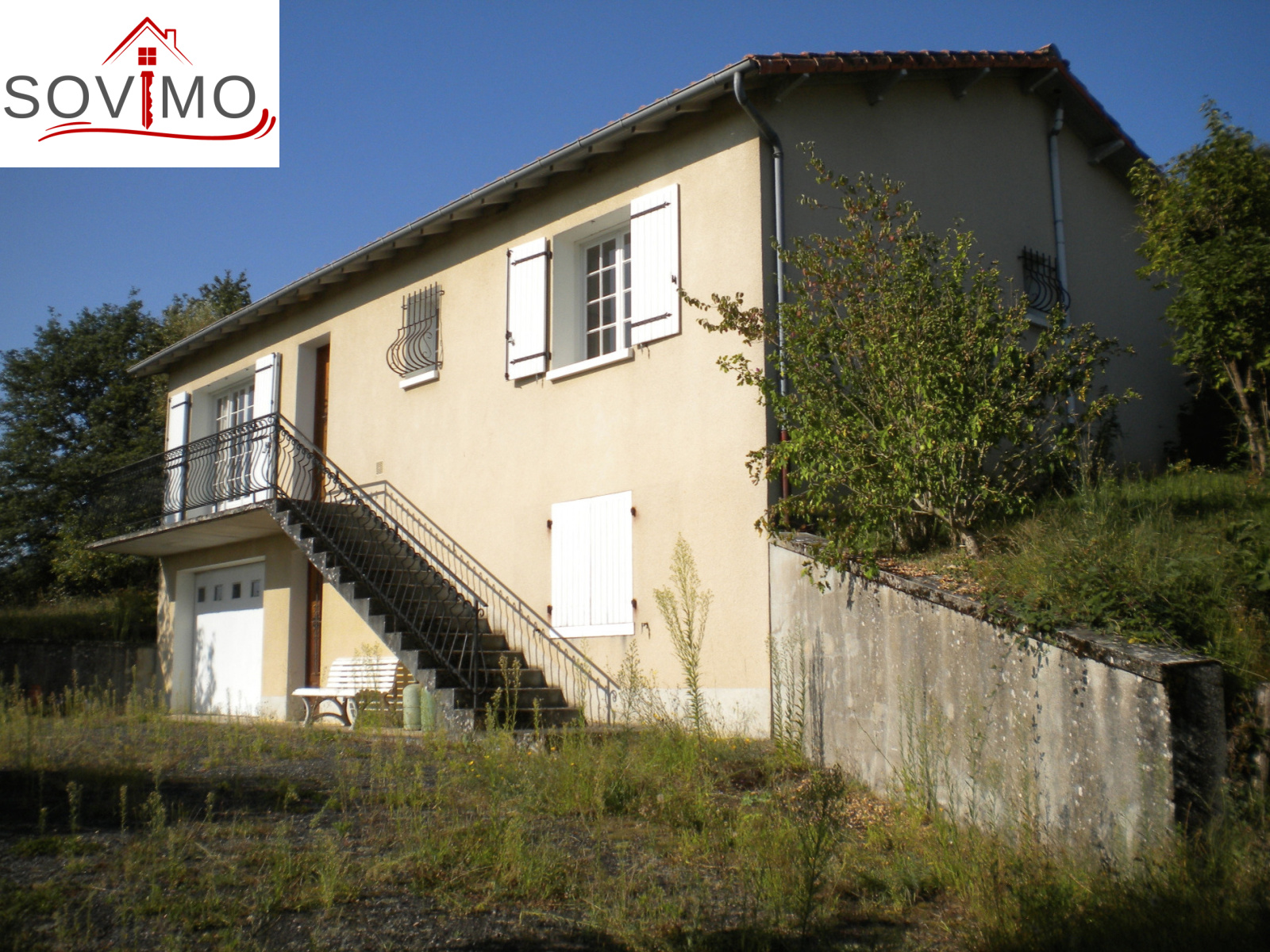 REF. 33826 : 93 500 euros H.Ag.Incl., proche Confolens (16), dans un bourg, pavillon sur sous sol semi enterré de 1979, 88 m2 env. utilisables : entrée, cuisine amé.équip., salon/séjour, couloir, 2 chambres, salle de bain, wc, chauf.fuel/bois, sous sol : garage 31 m2, buanderie/chaufferie 30 m2, débarras 30 m2, tout à l'égout, + bâtiment indépendant avec garage 22 m2, grenier et débarras, petits toits, terrain attenant avec 2 puits, le tout sur 2075 m2.