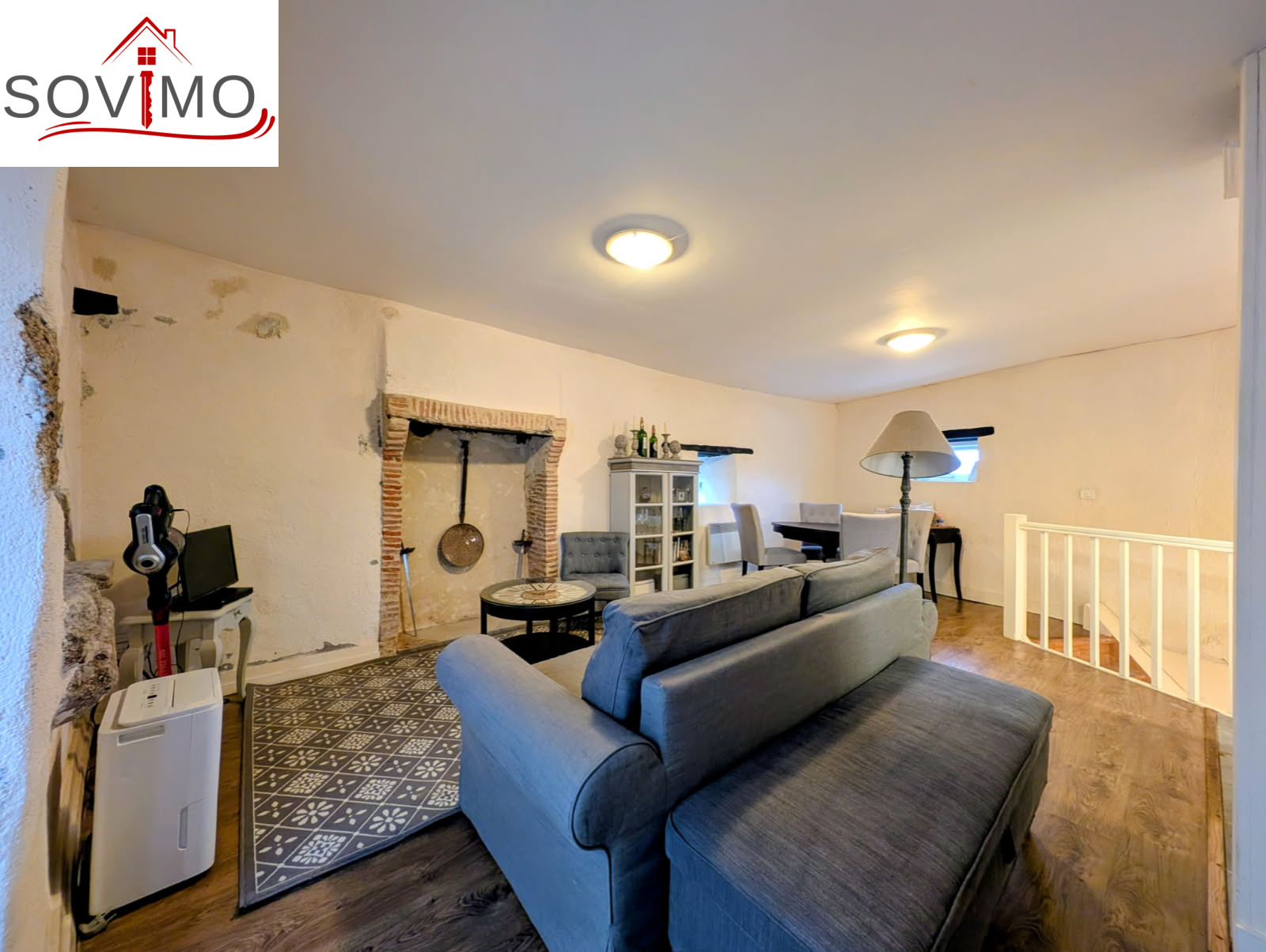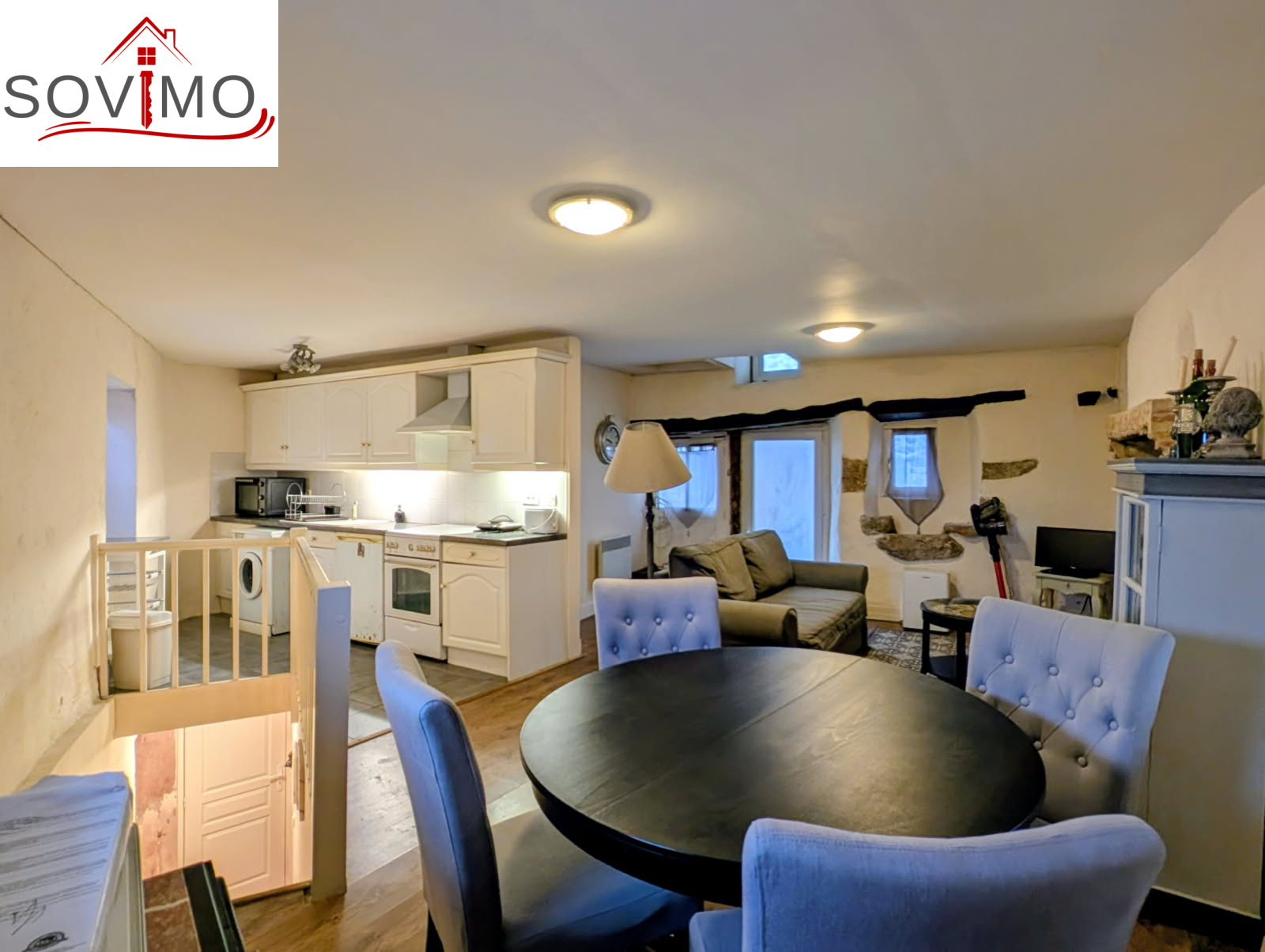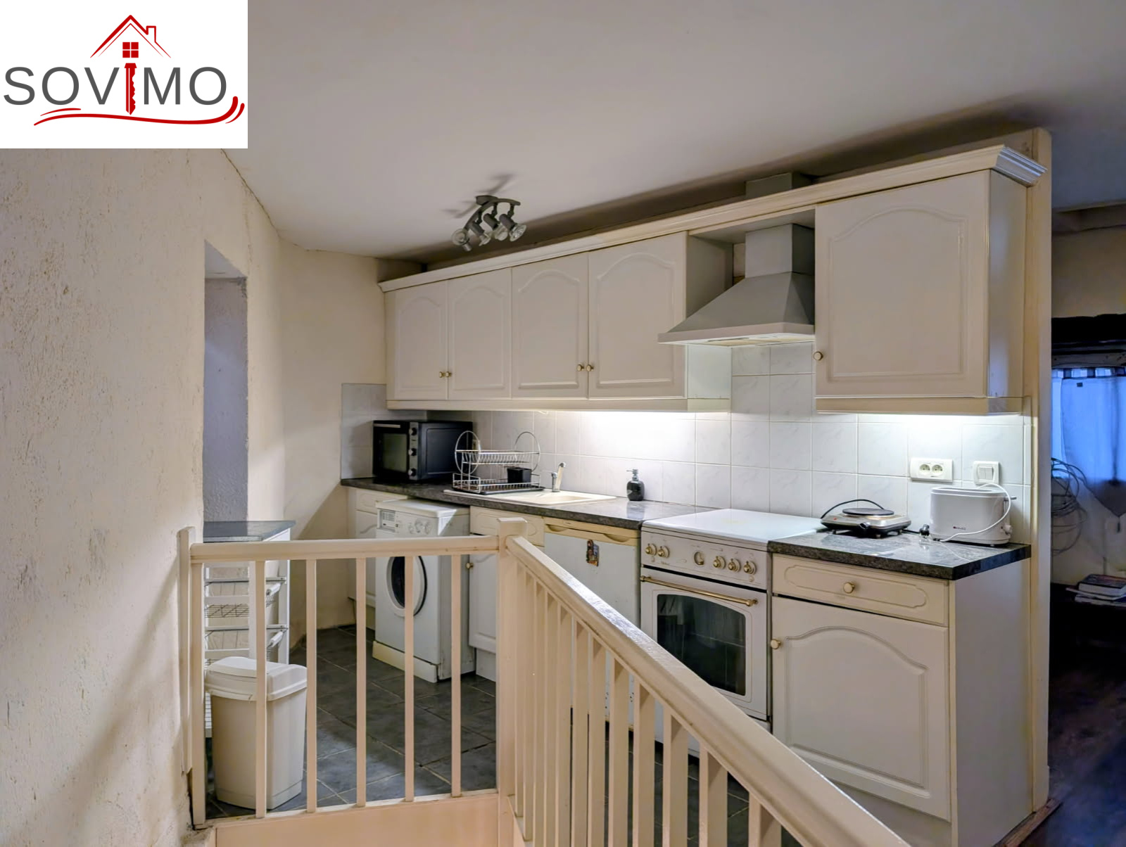 - Étage : cuisine aménagée et équipée ouverte sur séjour/salon, salle d’eau avec WC.