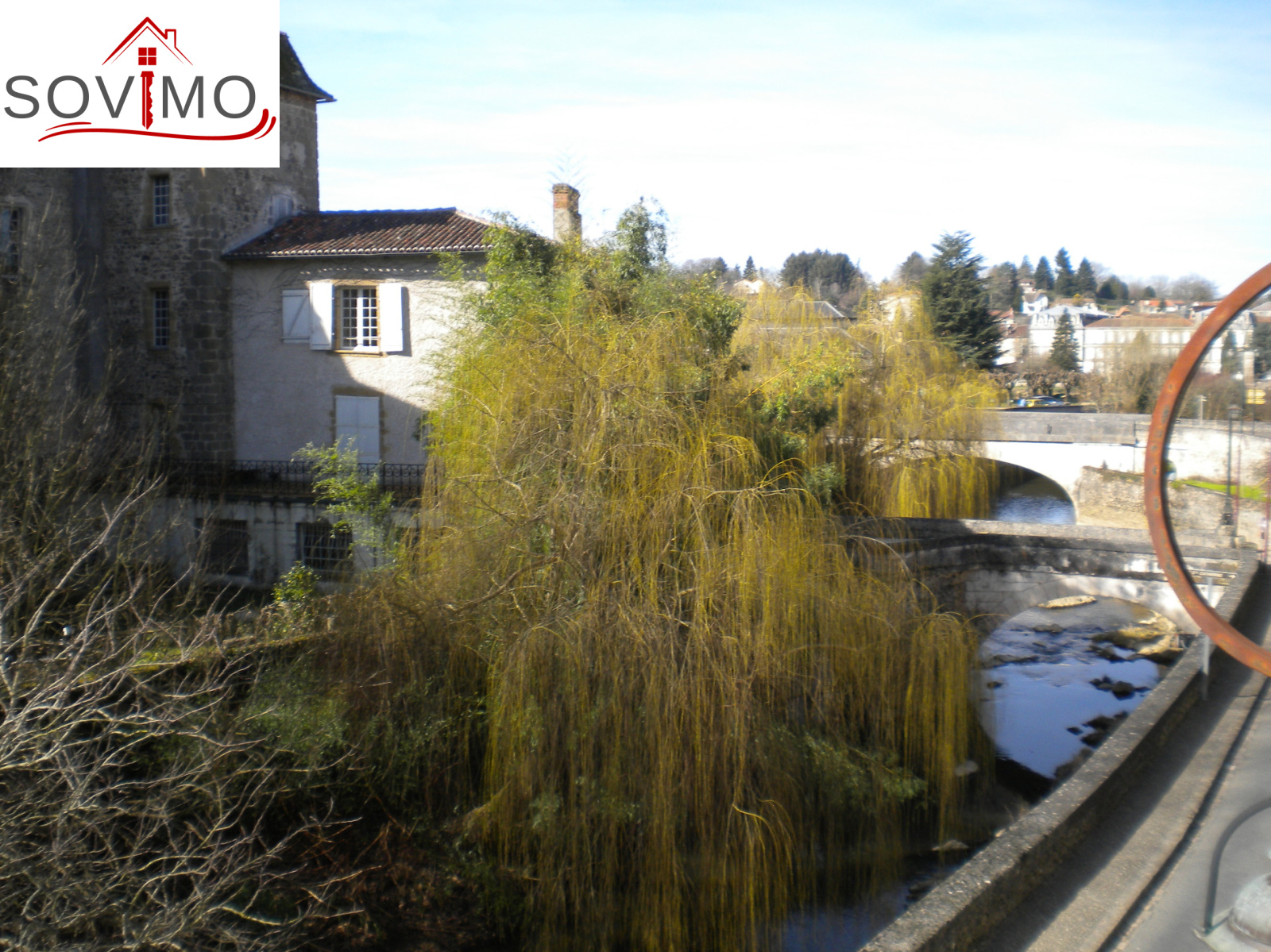 Réf. 25917 : 76 700 euros .H.Ag.incl., (16), Confolens (16), maison de ville à colombage avec vue sur rivière, 103 m² env. utilisables : cuisine aménagée équipée/séjour, salle d'eau, wc, étage 1 : 2 chambres, étage 2 : 1 chambre , chauf.électrique, grenier aménageable, cellier, tout à l'égout, courette à l'arrière.