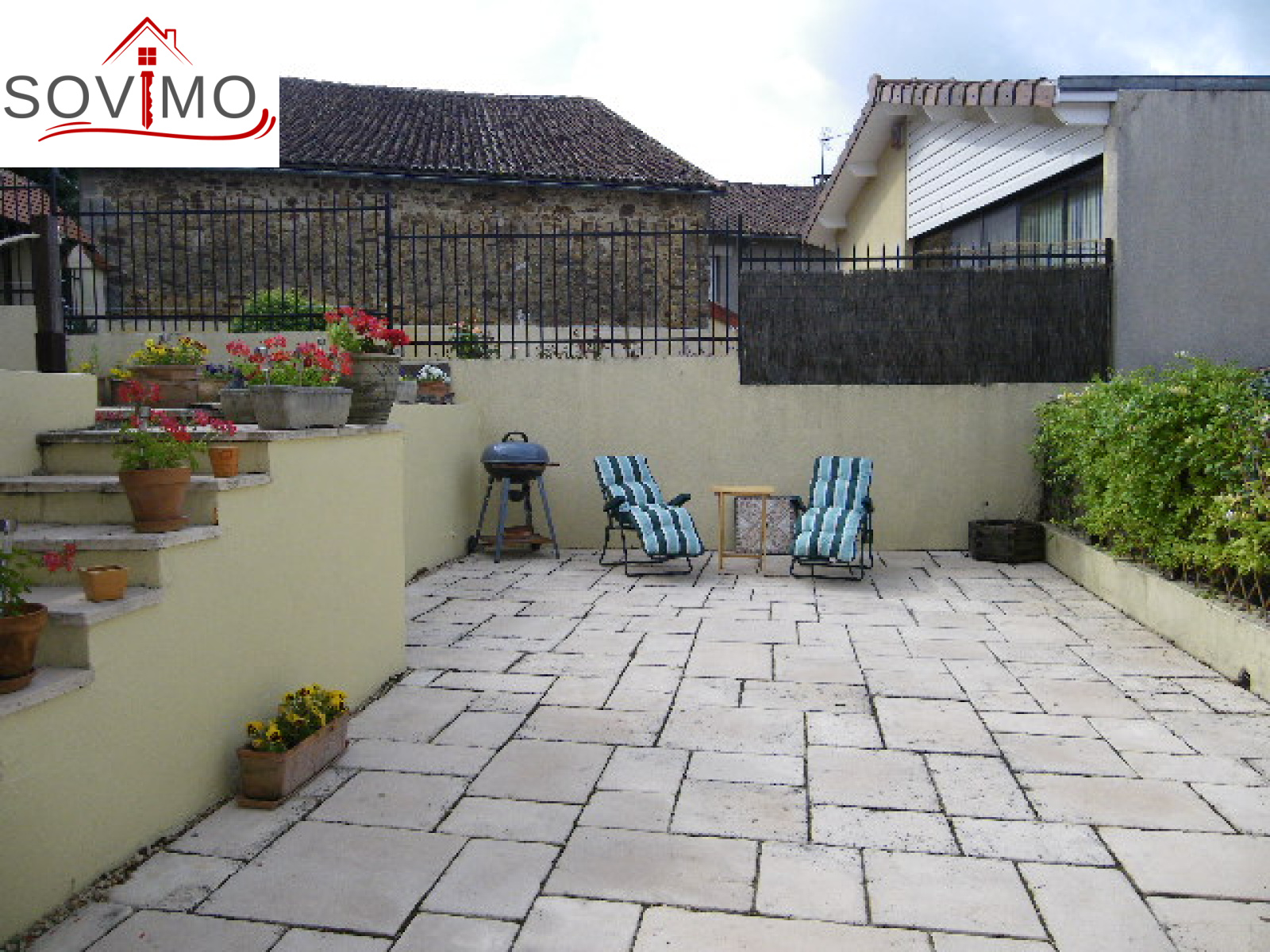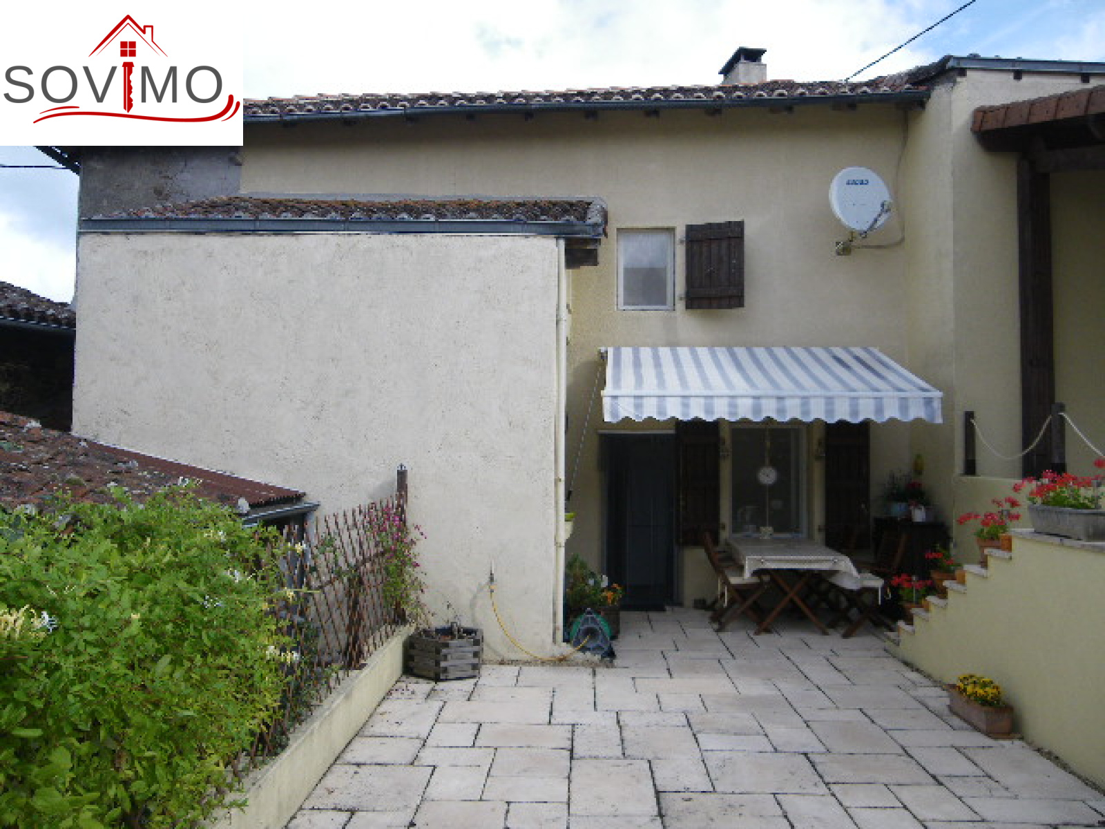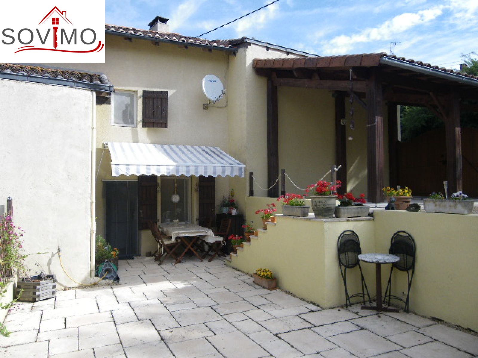 REF. 33418 : 71200 € Ag.incl. Charente (16), dans un bourg, maison de village mitoyenne, tout confort, 88 m2 env.utilisables : cuisine, salon, séjour, étage : 2 chambres, salle de bain/wc, grenier, cave, buanderie 8 m2, appenti 18 m2, terrasse, cour, tout à l'égout, Double vitrage.