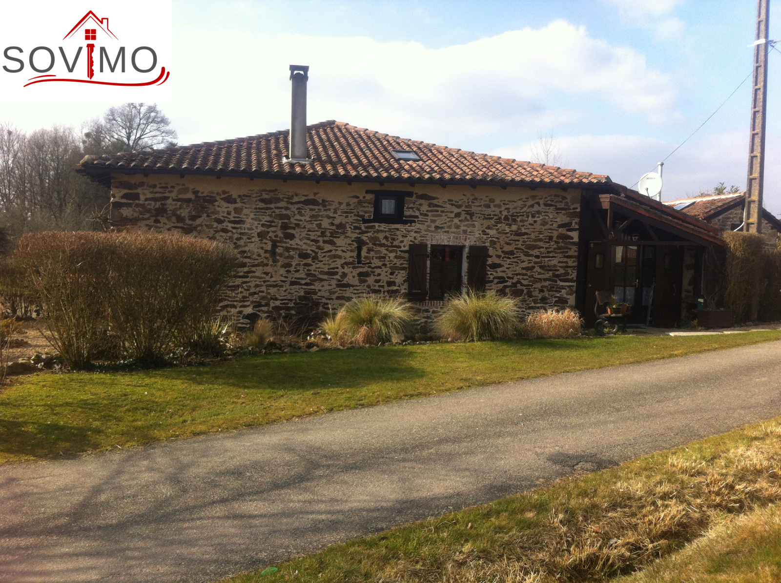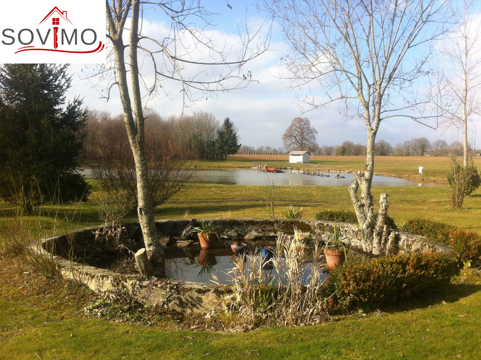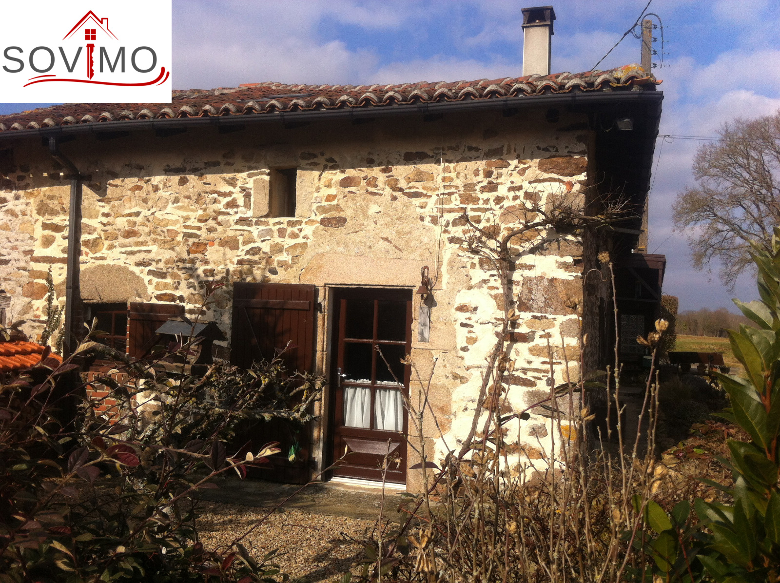 REF. 33496 : 89 900 € Ag. Incl., charente (16), dans hameau, jolie maison de campagne, en pierres apparentes, rénovée, 81 m2 env. habitable : cuisine aménagée, séjour, salon, sdb/wc, étage : palier, 2 chambres, cheminée/insert, garage en bois 23 m2, petit chalet d'une pièce 15 m2, fosse toutes eaux, terrain attenant avec petite mare artificielle, le tout sur 1630 m2.