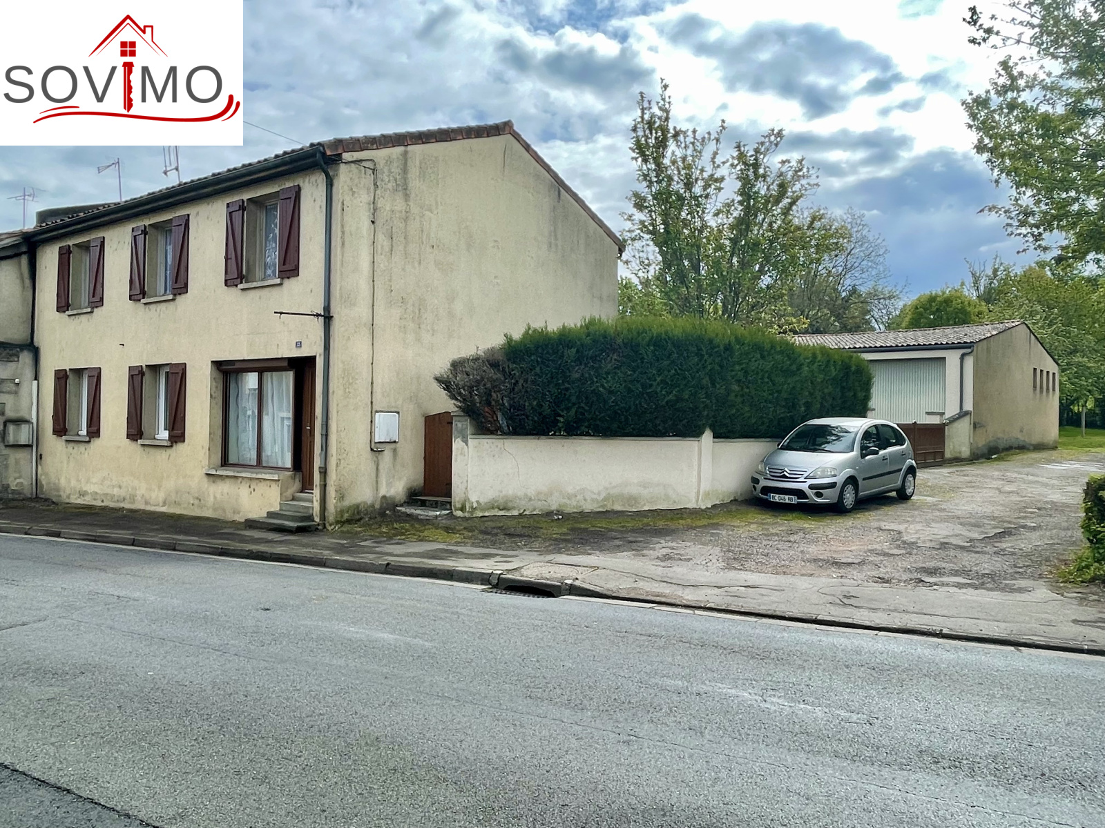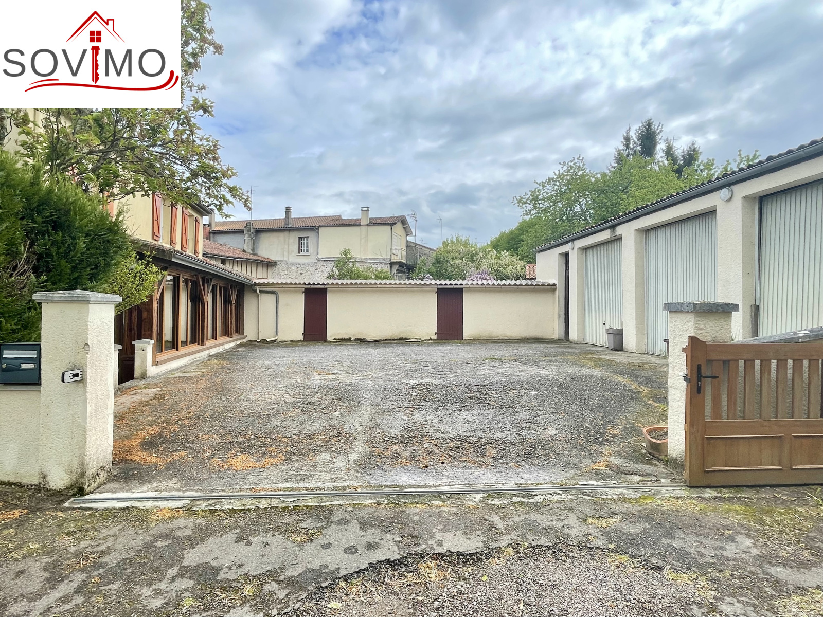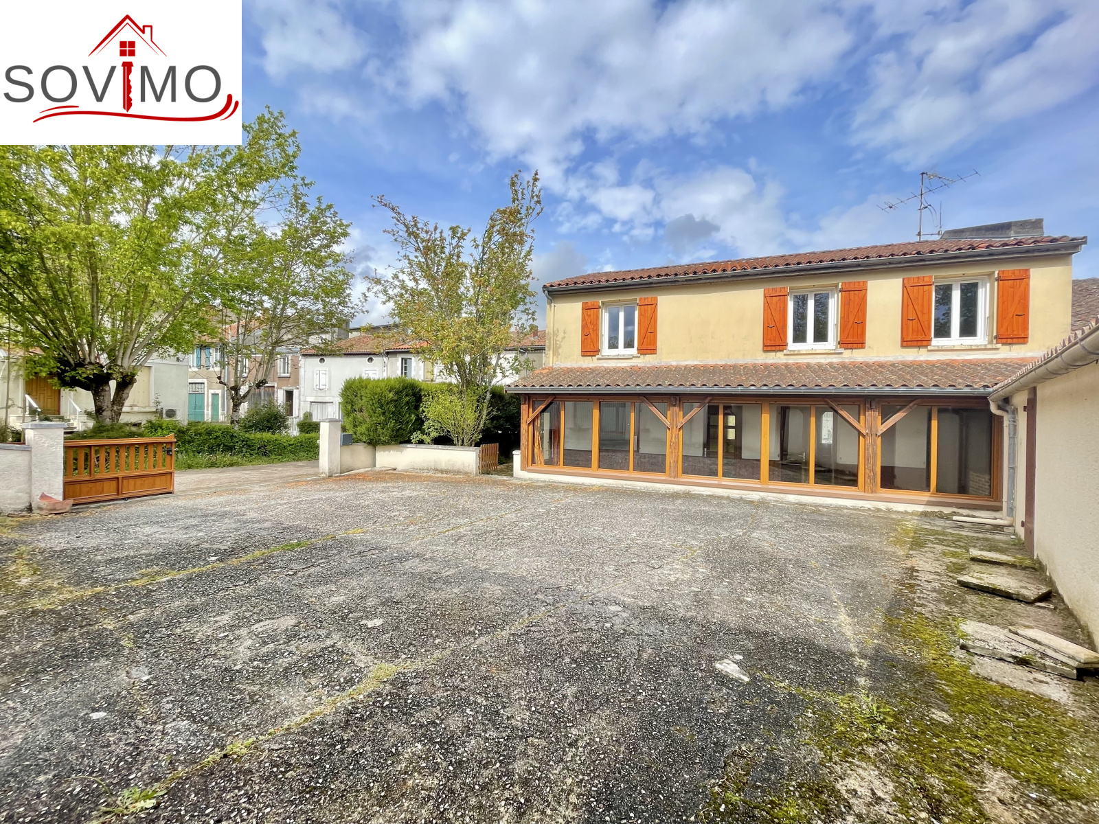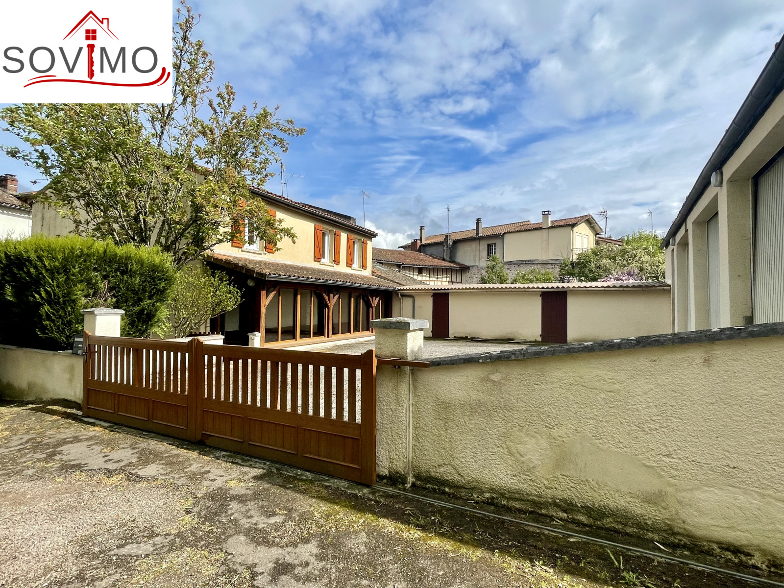 REF. 34613 : 113 400 euros H.A.I, Confolens (16), tous commerces, en bord de route, sans vis à vis, maison de ville mitoyenne, tout confort, en partie rénovée, à usage d'habitation, 139 m2 env. utilisables, composée au rez de chaussée : Véranda de 18 m2, entrée, cuisine, salon/séjour (cheminée), cabinet de toilette, 1 chambre, dressing, à l'étage : palier, 4 chambres, salle d'eau, wc, chauffage électrique, assainissement collectif CONFORME. Grand garage indépendant de 145 m2 avec cabinet toilette, petit toit de 15 m2, courette attenante, le tout sur 444 m2.