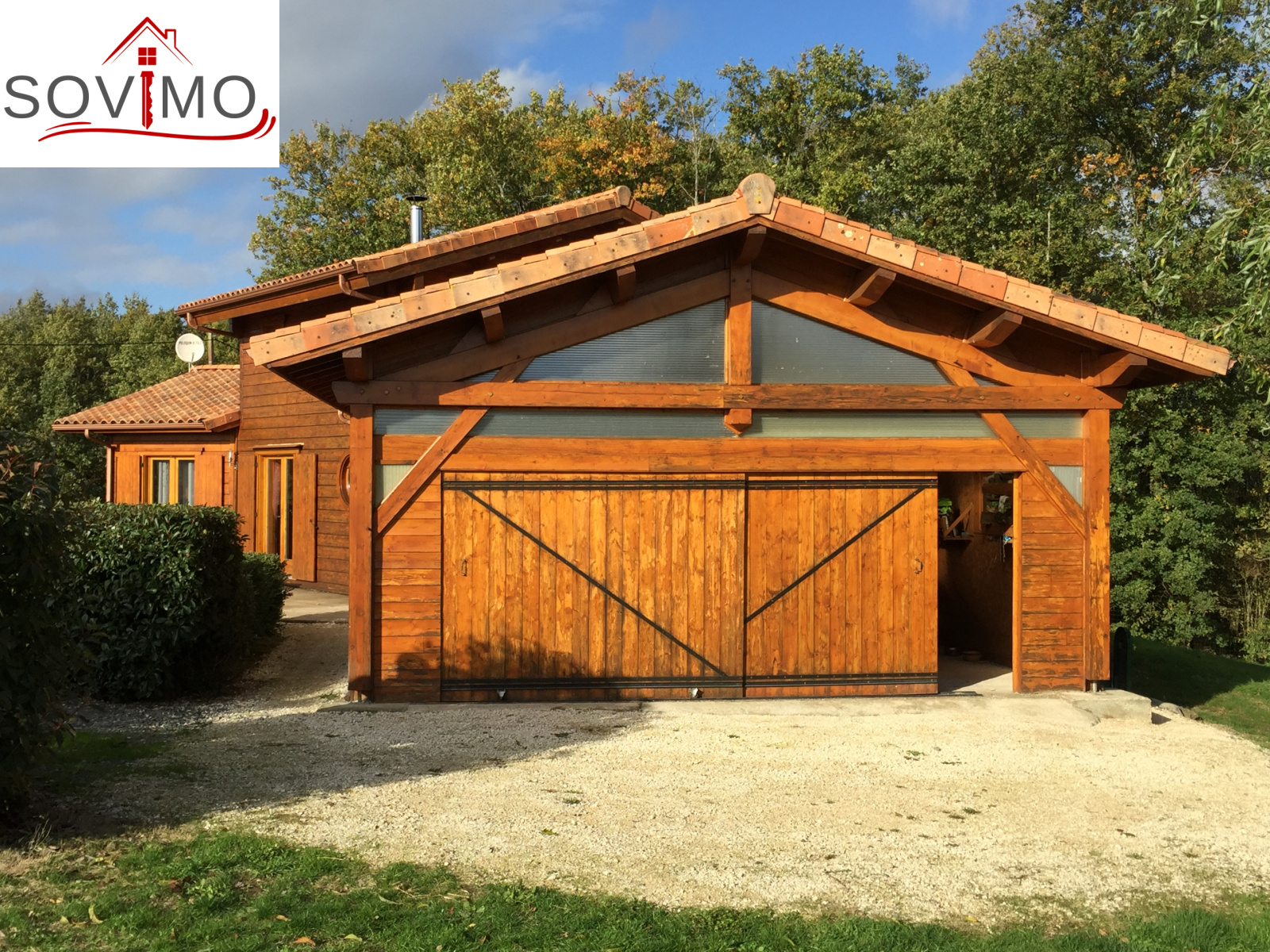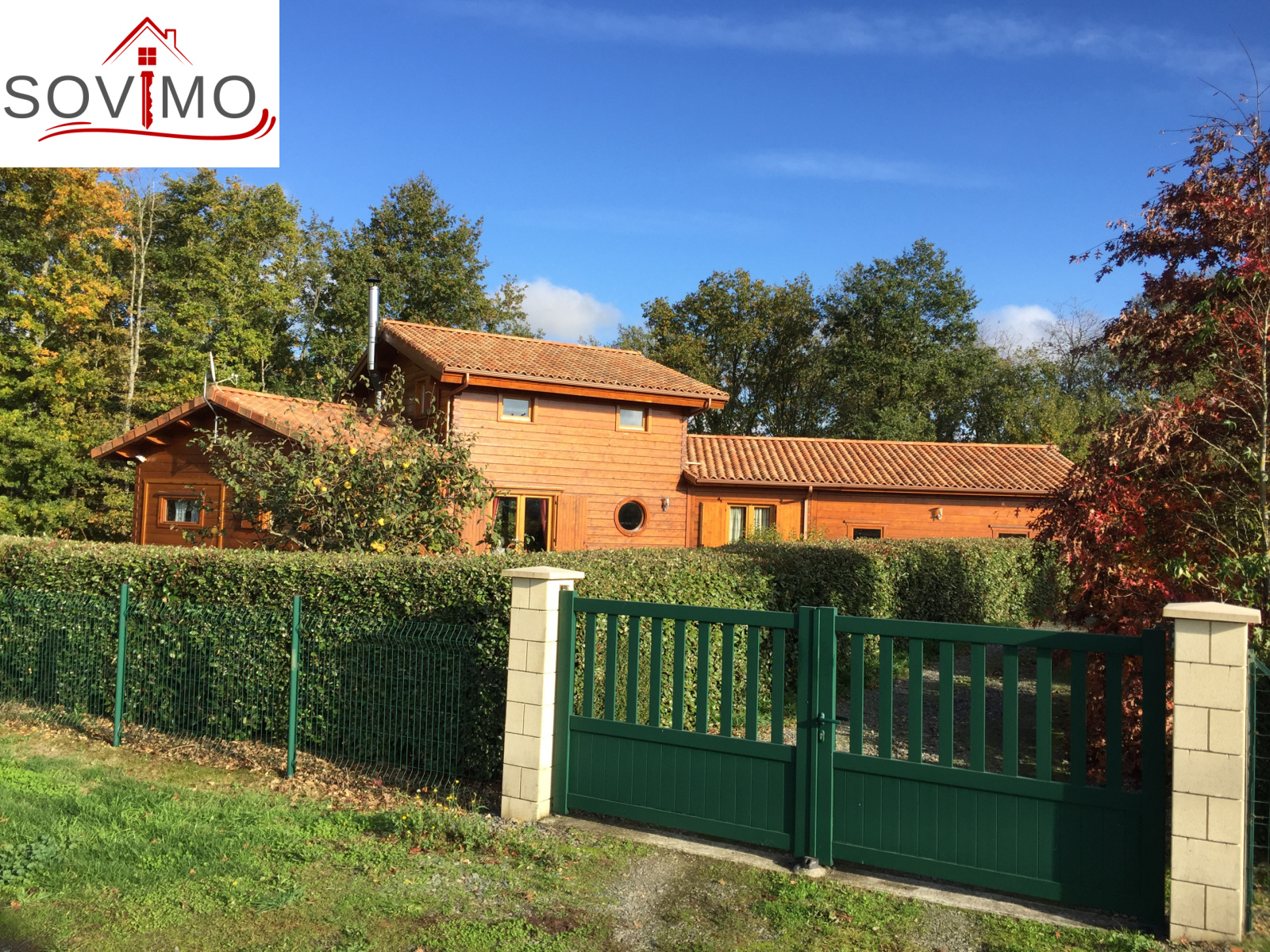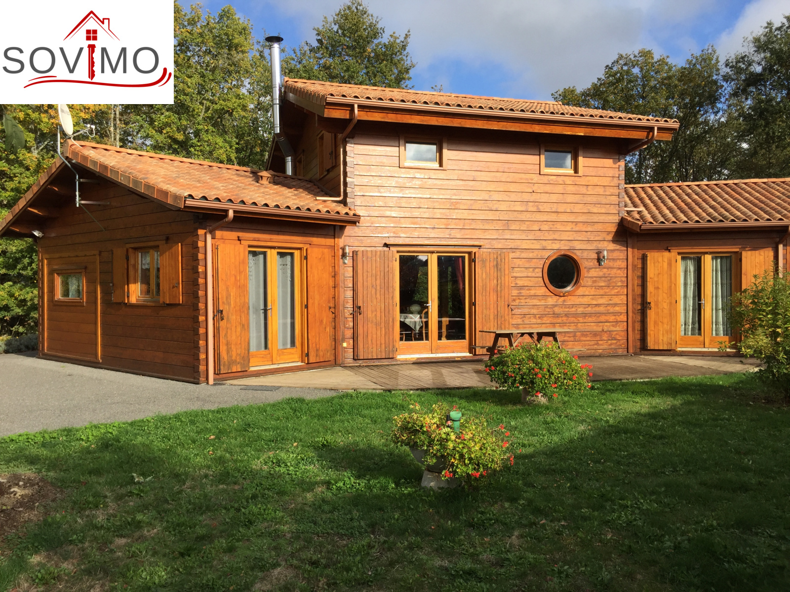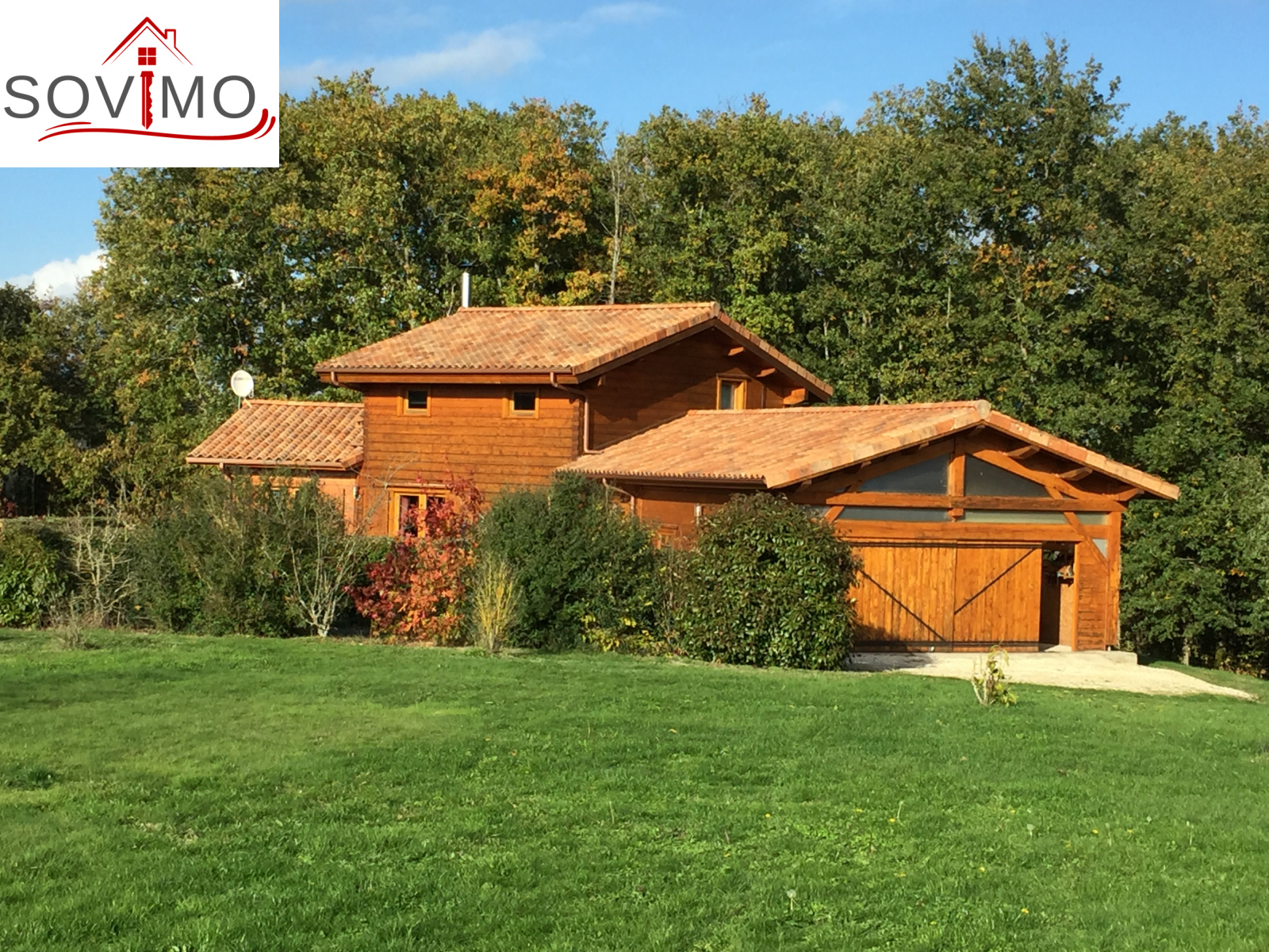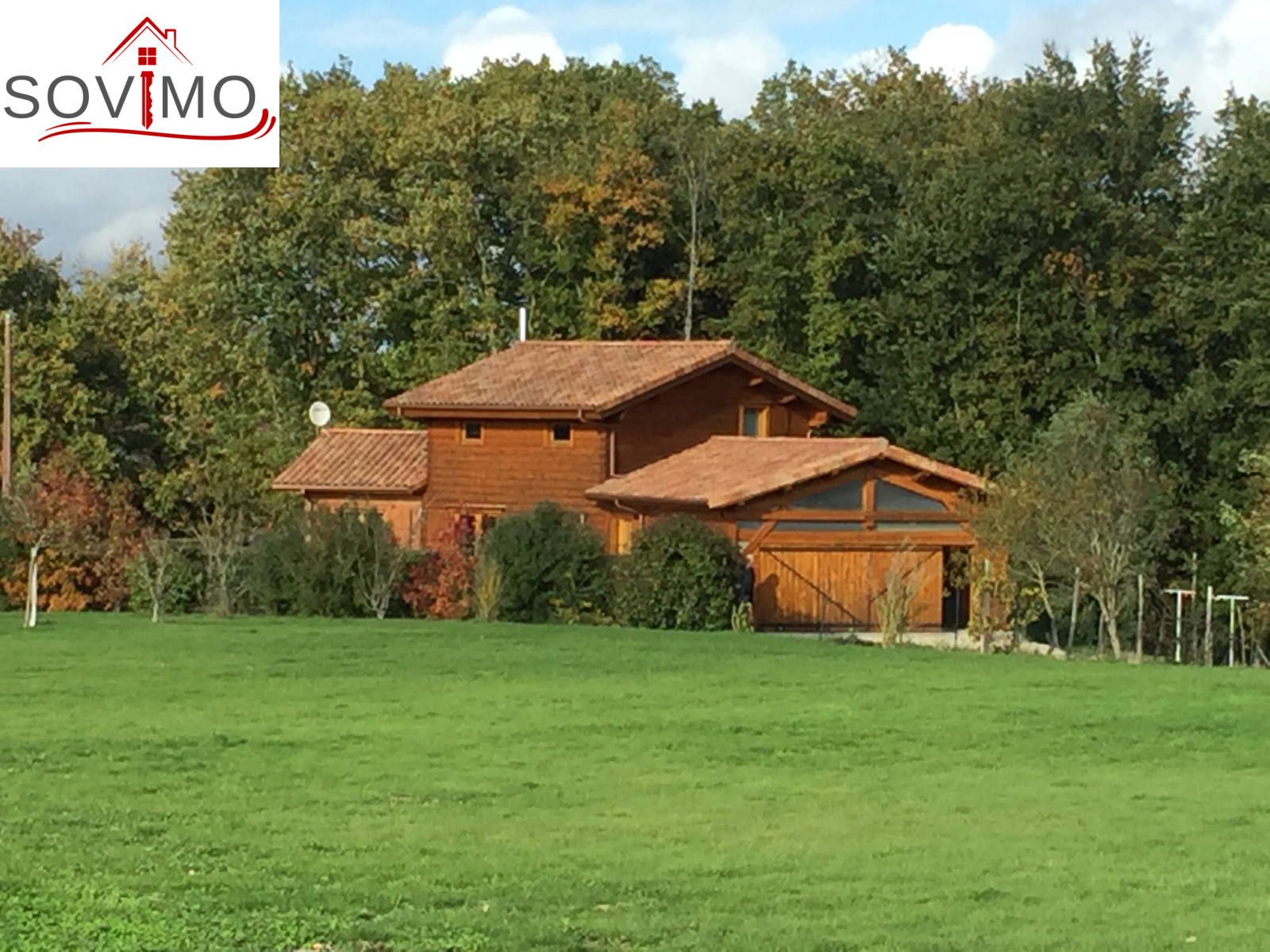 REF.33981 : 216 000 euros H.Ag.Incl., St Laurent de Ceris (16) à 19.6 km de Confolens, en campagne, maison atypique en bois de 2009 sur 1ha 15 env., 140 m2 env. utilisables : cuisine amé.équipée, arrière cuisine salon/séjour (poele à bois compact), dégagement, 1 chambre, salle de bain, cabinet de toilette, à l'étage : palier/bureau, 2 chambres, chauf.électrique, fosse toutes eaux, terrasse en bois, garage double de 38 m2 avec atelier, terrain attenant avec bois et abri de jardin.