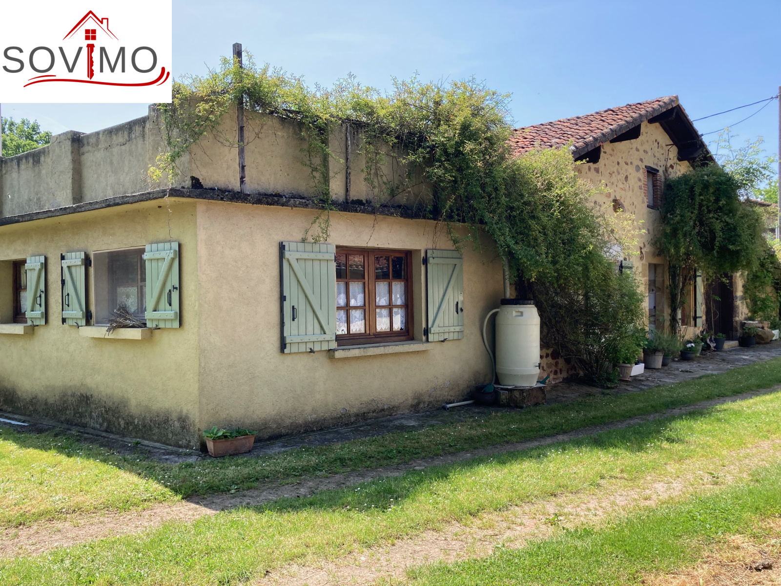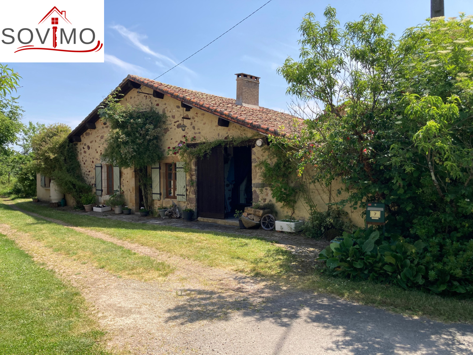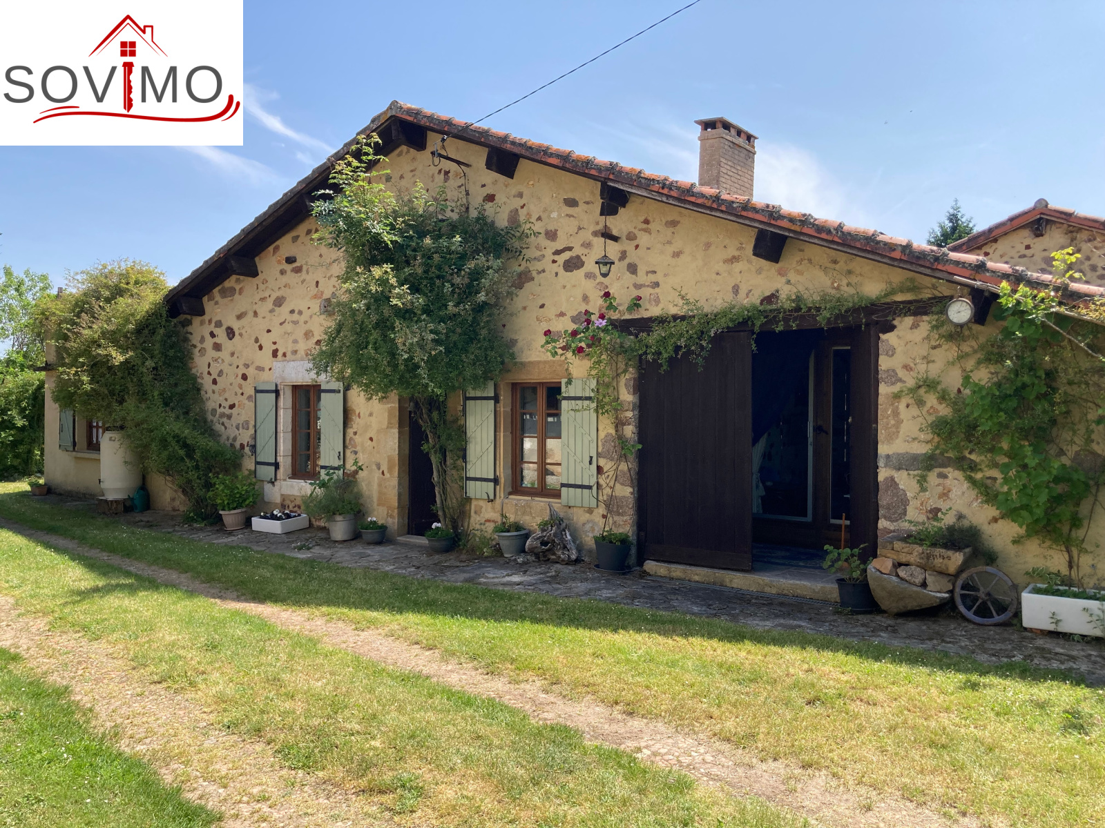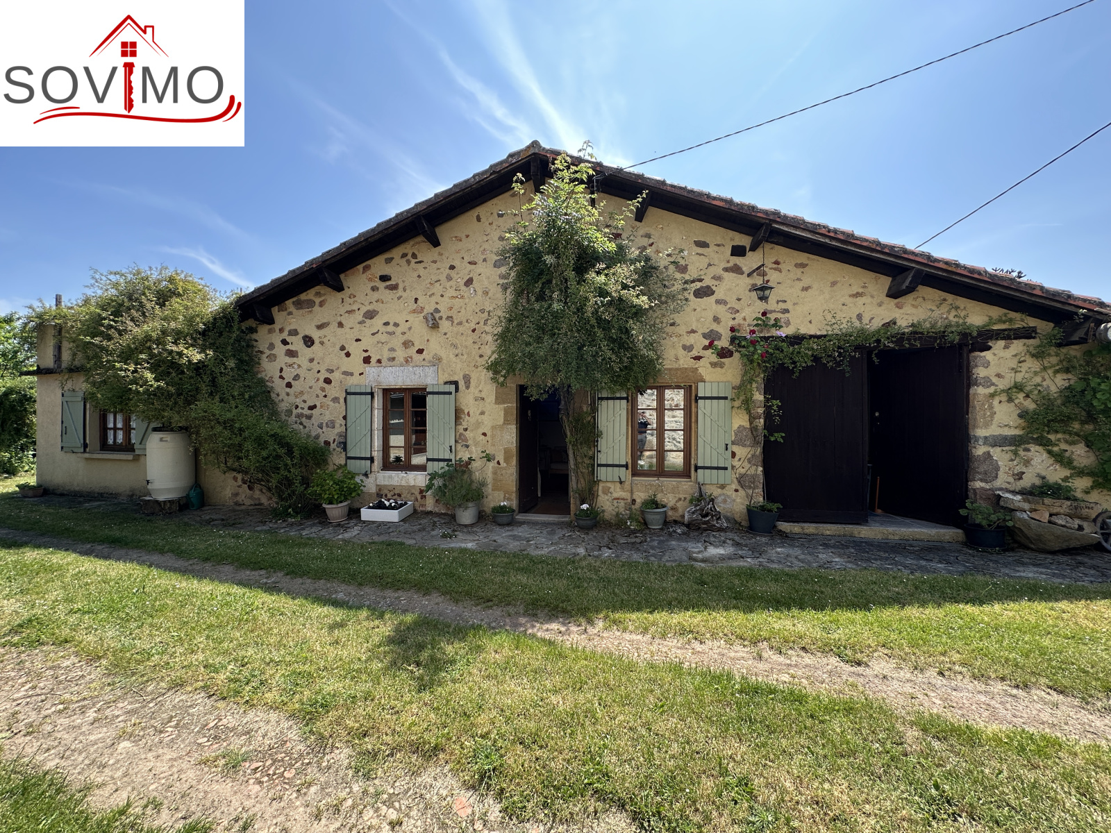 RÉF; 34502 : 66 000 euros H.A.I, AVAILLES LIMOUZINE (86), EXCLUSIVITÉ ! à 3 kms d'une petite ville avec commerces, dans un hameau, jolie maison de campagne en pierre de pays, mitoyenne, à usage d'habitation, 114 m2 env. utilisables, composée au rez de chaussée : entrée, cuisine aménagée, séjour (poêle à bois), salon (cheminée),1 chambre, 2 salles d'eau/wc, à l'étage : mezzanine/chambre. Fosses toutes eaux. Terrasse surélevée de 16 m2 env., garage attenant de 52 m2 et un proche fermé de 5 m2. Parcelle boisée séparée en bordure de rivière de 2ha env., non constructible.