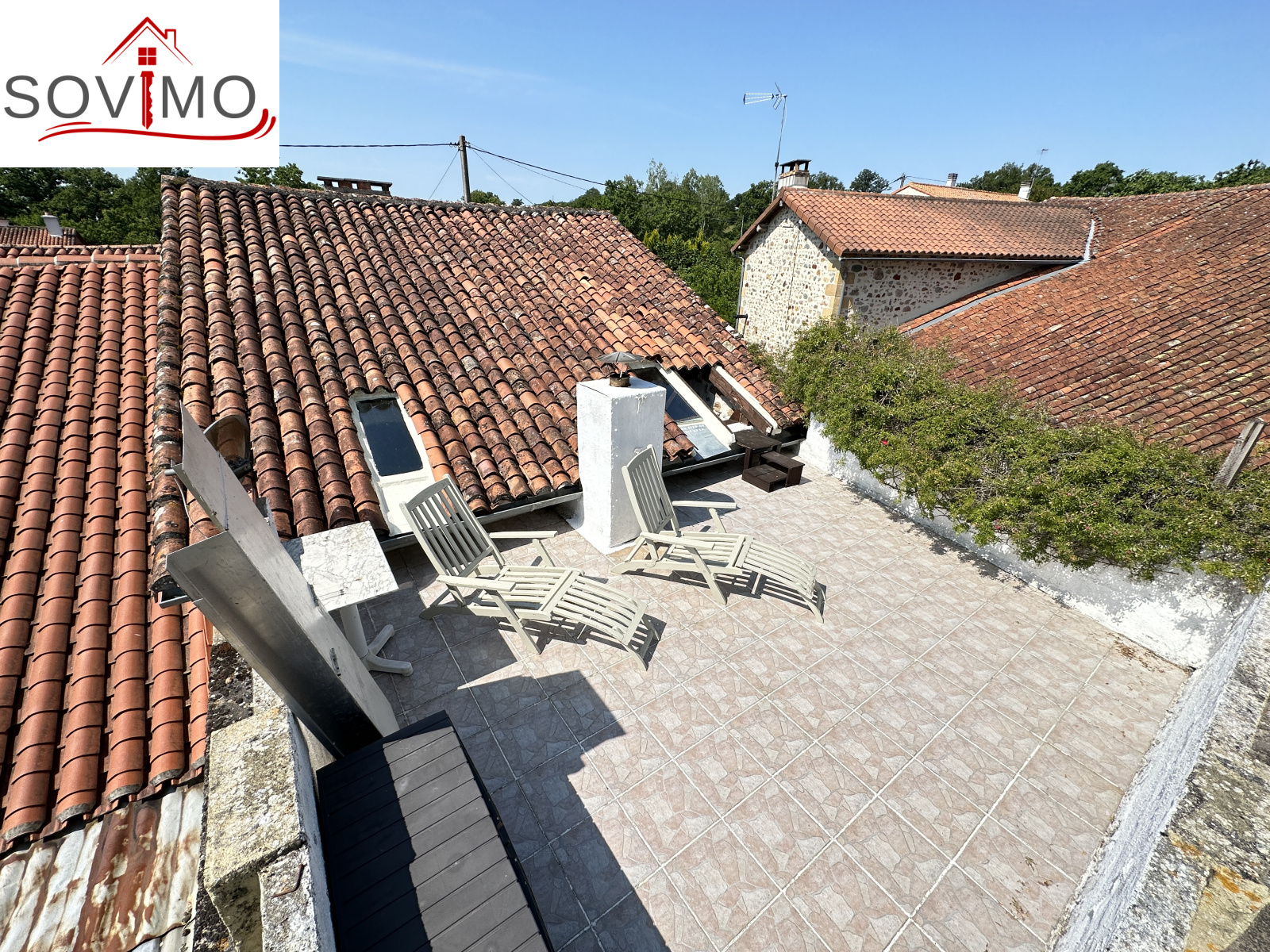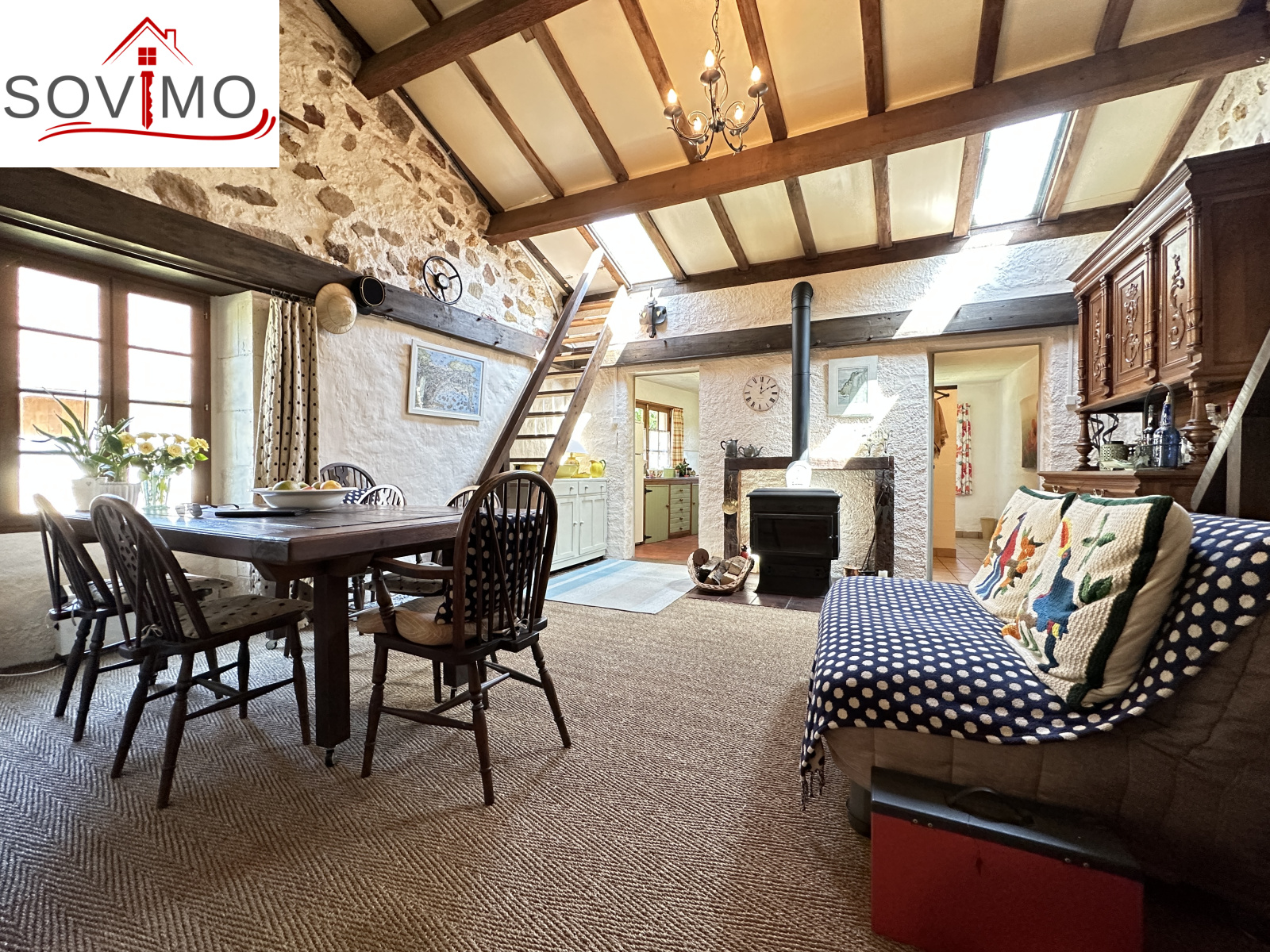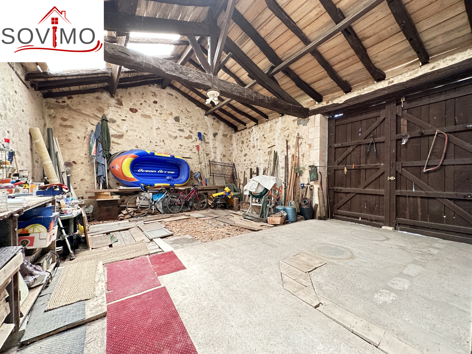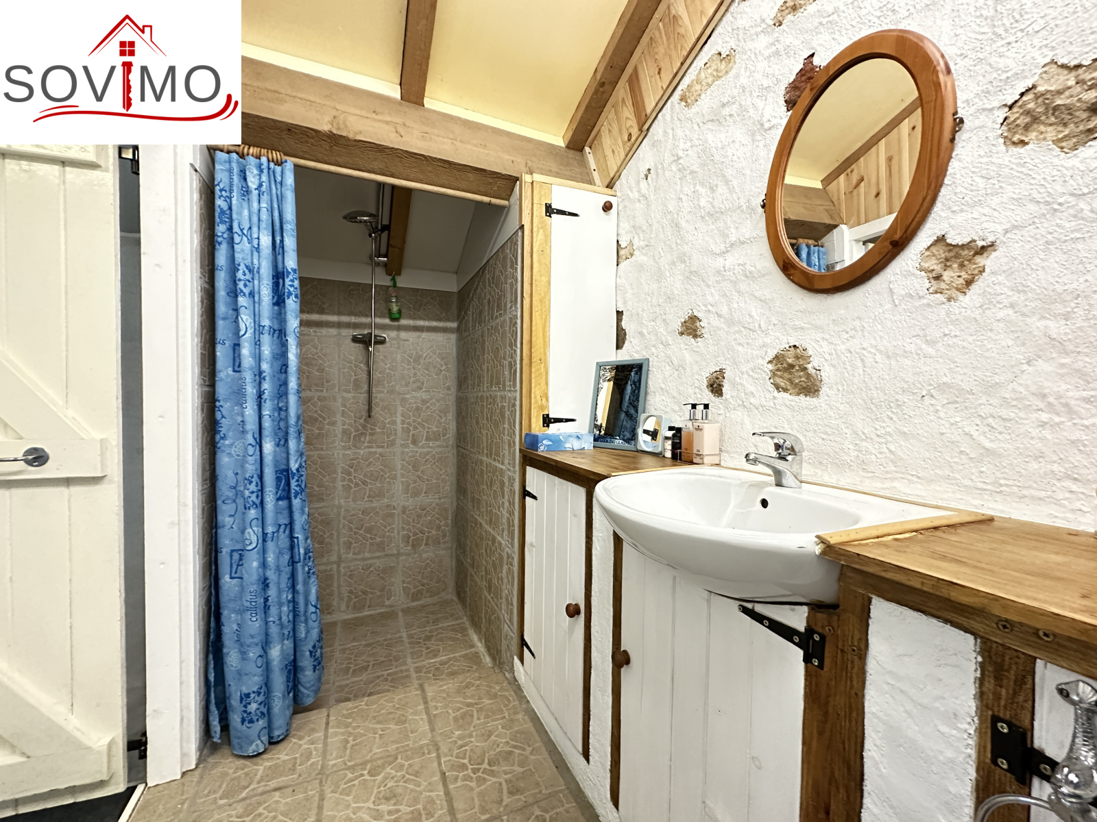 RÉF; 34502 : 66 000 euros H.A.I, AVAILLES LIMOUZINE (86), EXCLUSIVITÉ ! à 3 kms d'une petite ville avec commerces, dans un hameau, jolie maison de campagne en pierre de pays, mitoyenne, à usage d'habitation, 114 m2 env. utilisables, composée au rez de chaussée : entrée, cuisine aménagée, séjour (poêle à bois), salon (cheminée),1 chambre, 2 salles d'eau/wc, à l'étage : mezzanine/chambre. Fosses toutes eaux. Terrasse surélevée de 16 m2 env., garage attenant de 52 m2 et un proche fermé de 5 m2. Parcelle boisée séparée en bordure de rivière de 2ha env., non constructible.