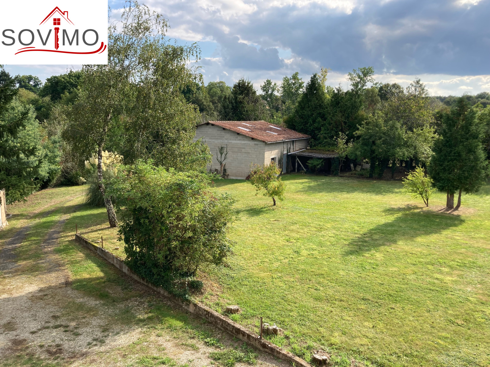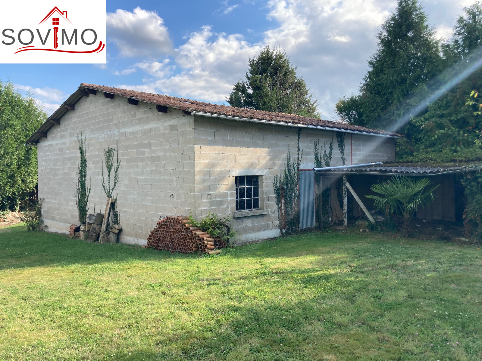 garage indépendant de 134 m2 en parpaing/fibro-ciment, toiture tuile avec grenier au dessus, petits toits, terrasse, puits