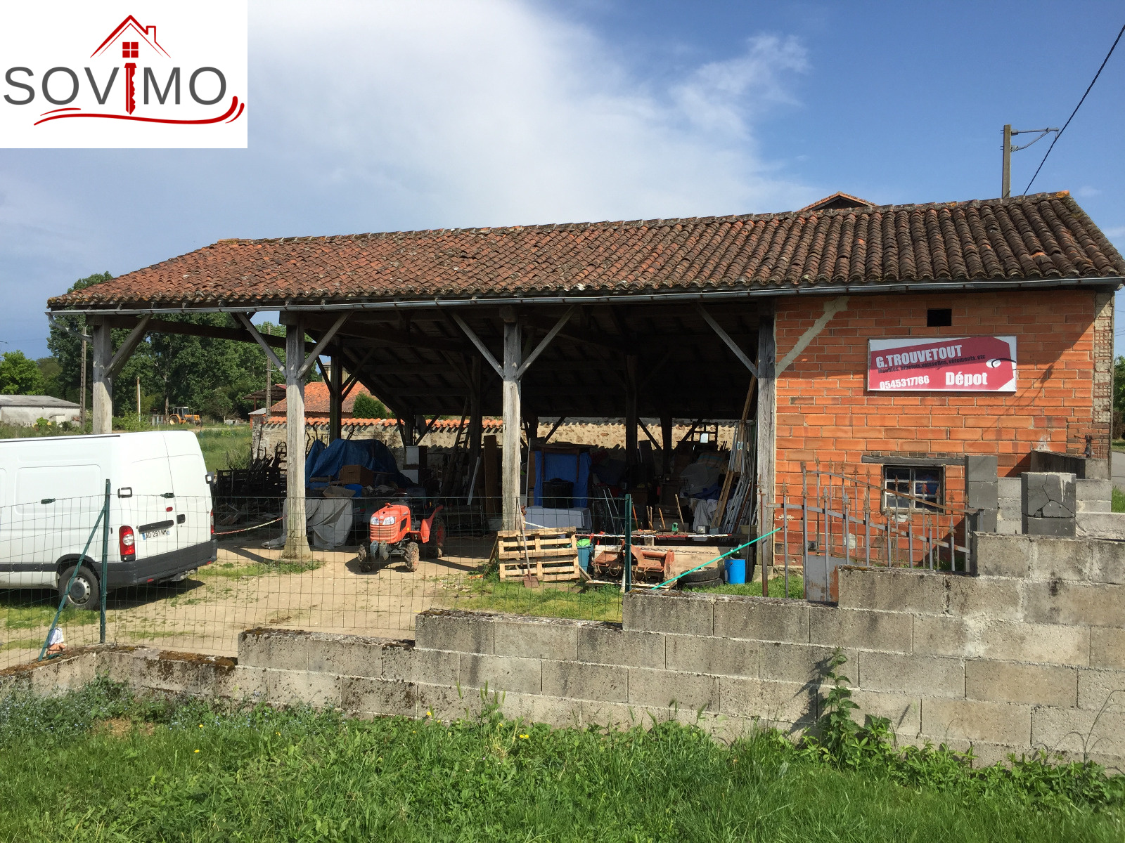 Terrasse, divers petits toits, grange attenante 145 m2 (toiture tuile état d'usage), hangar ouvert 120 m2 avec remise, porcherie, ancien four à pain, puits.