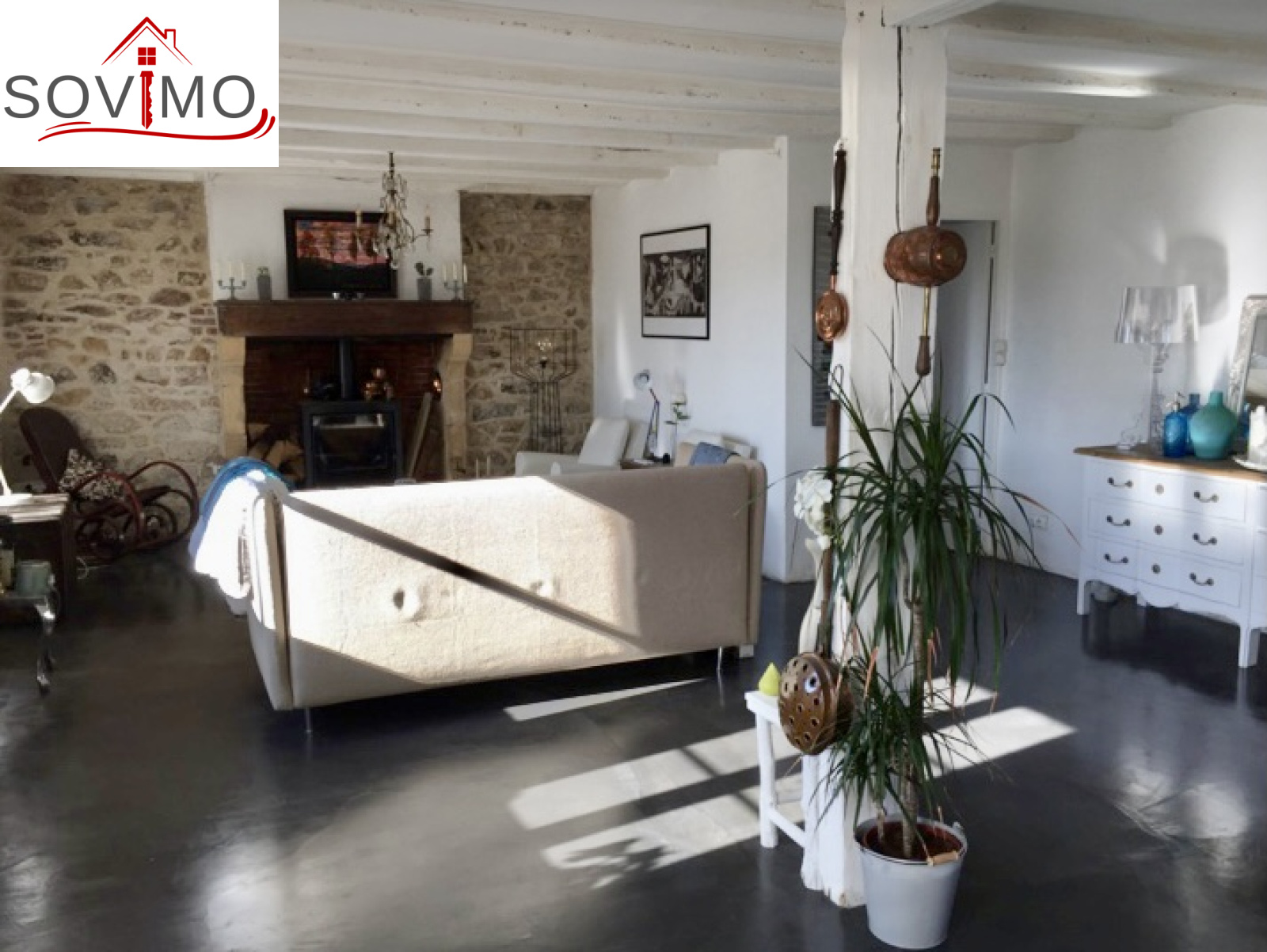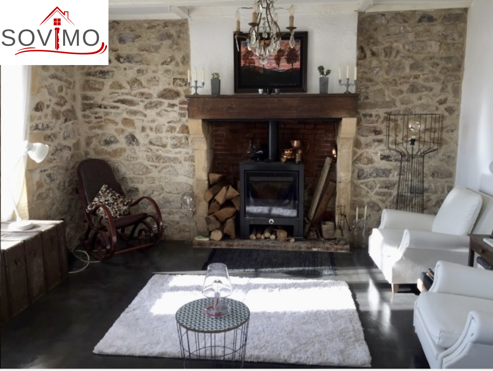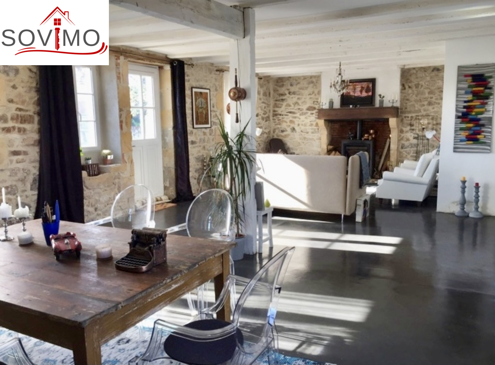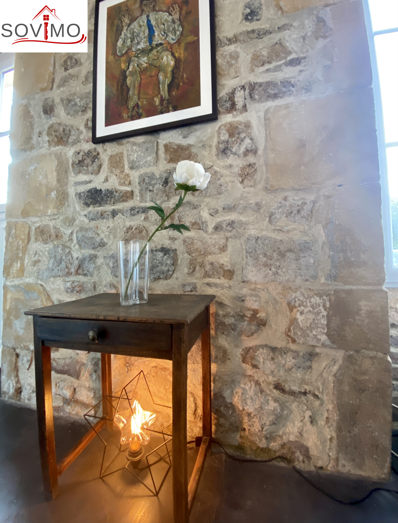 Maison principale : maison individuelle, récemment rénovée, en belle pierre sablée d'origine, avec portes et fenêtres neuves à double vitrage, sur 178 m² minimum de surface habitable : sol en béton poli, cuisine/salon/salle à manger équipée d'une cheminée en pierre d'origine avec poêle à bois à granulés, buanderie et salle d'eau/wc au rez-de-chaussée.