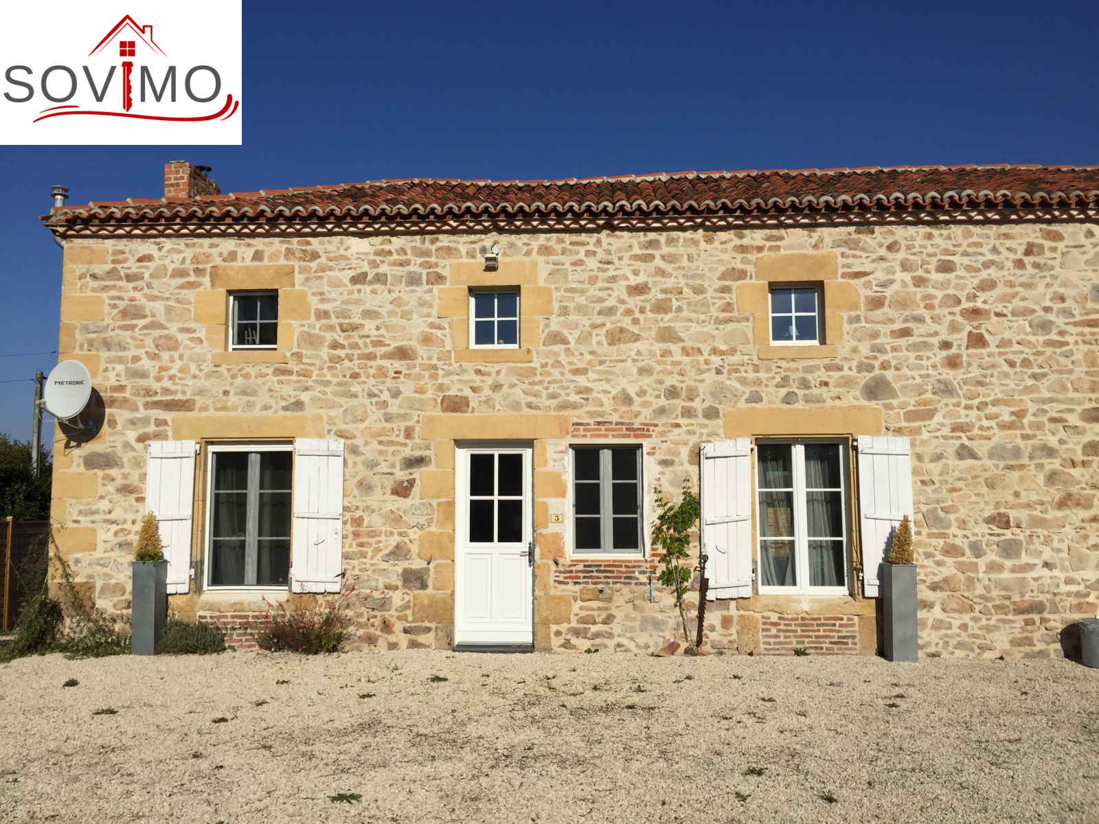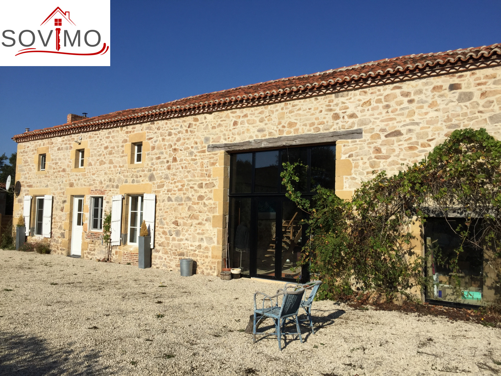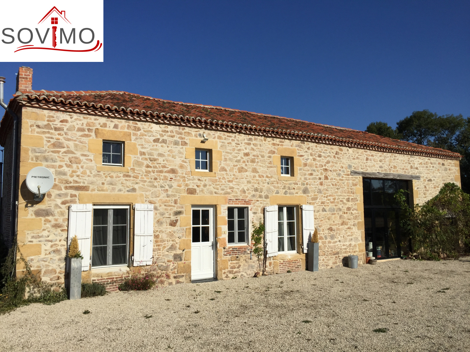 Maison principale : maison individuelle, récemment rénovée, en belle pierre sablée d'origine, avec portes et fenêtres neuves à double vitrage, sur 178 m² minimum de surface habitable : sol en béton poli, cuisine/salon/salle à manger équipée d'une cheminée en pierre d'origine avec poêle à bois à granulés, buanderie et salle d'eau/wc au rez-de-chaussée.