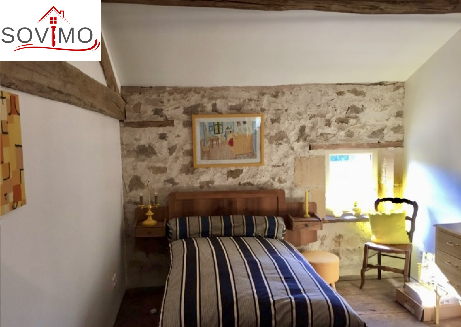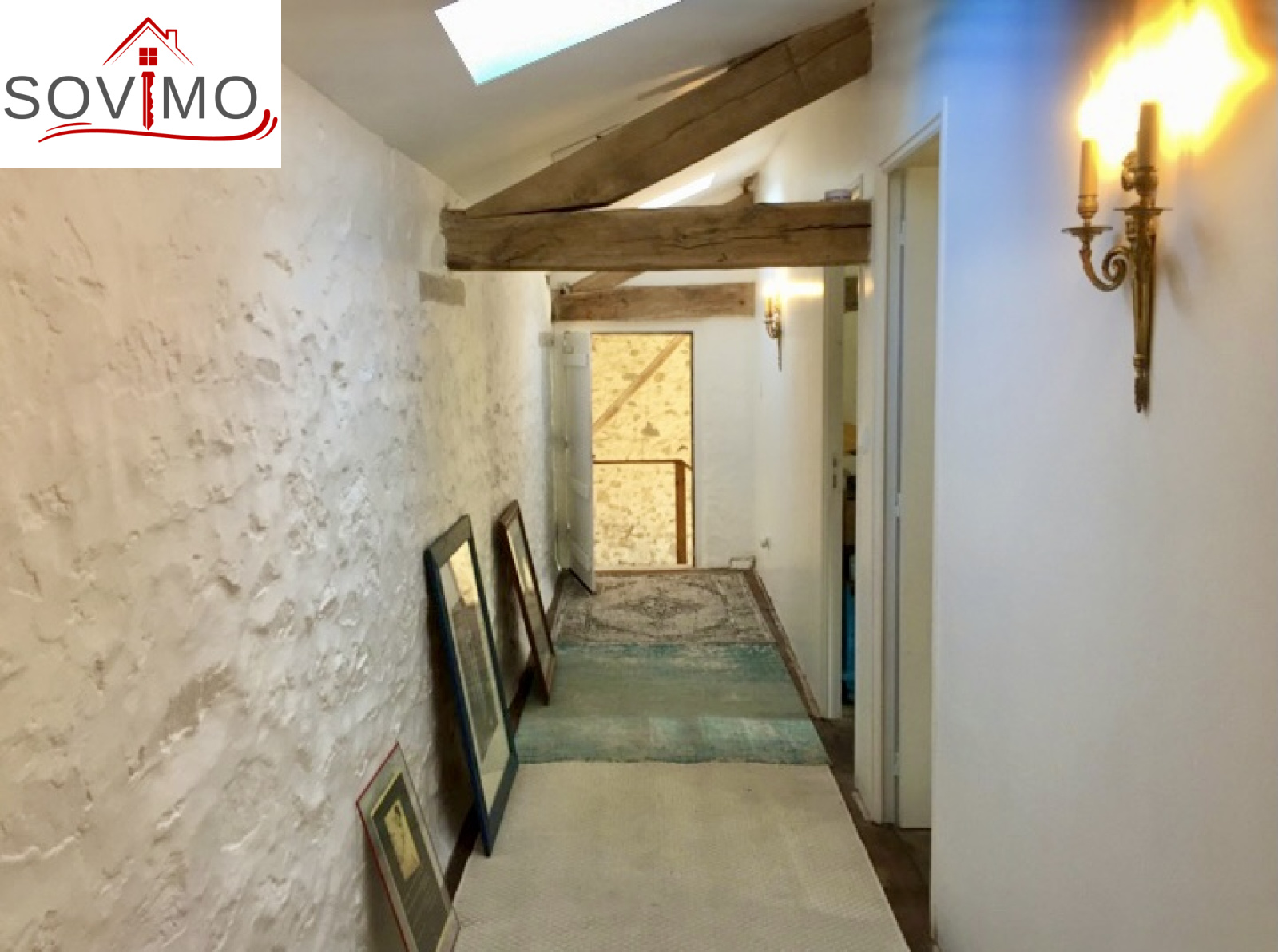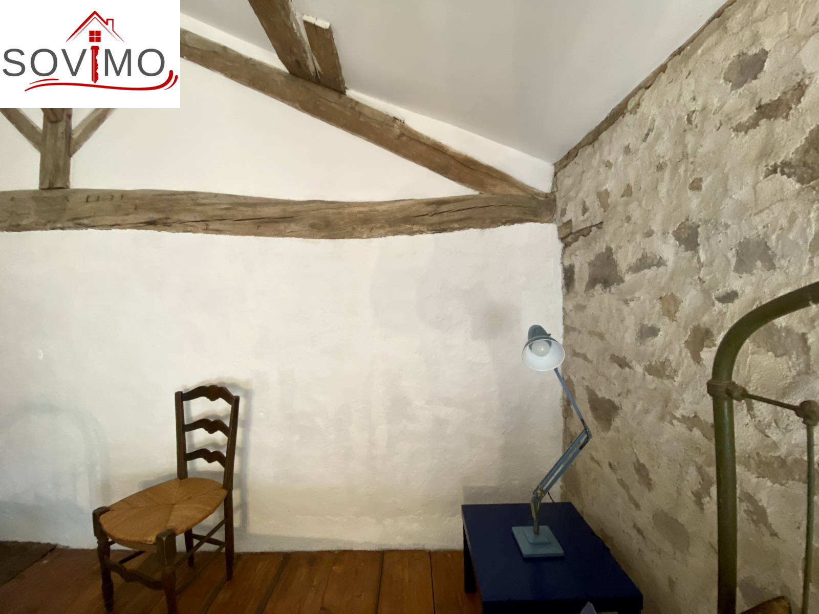 Egalement accessible depuis le rez-de-chaussée : ancienne grange attenante de double hauteur rénovée avec toiture isolée, poutres apparentes, portes et velux neufs, double vitrage.
