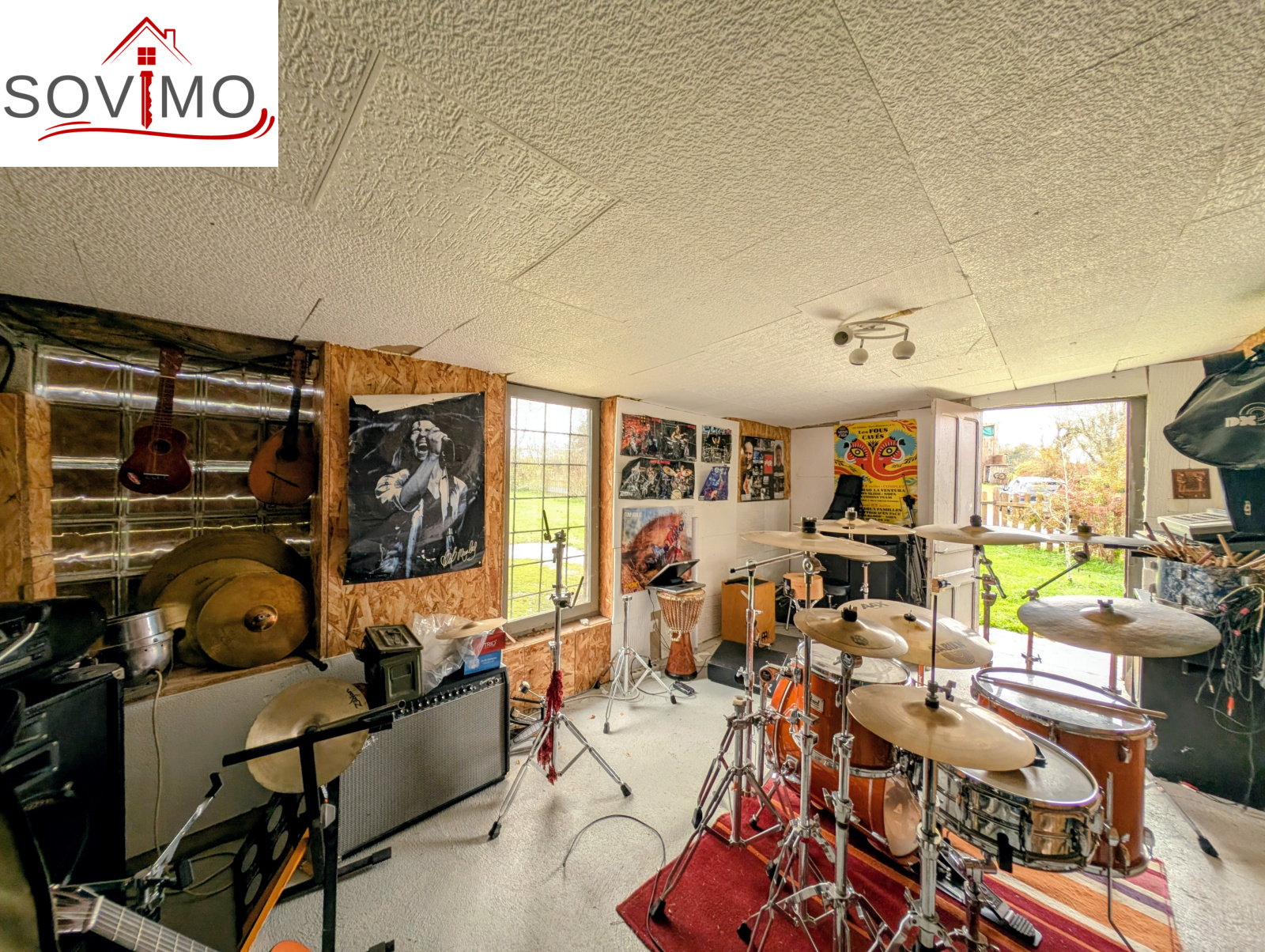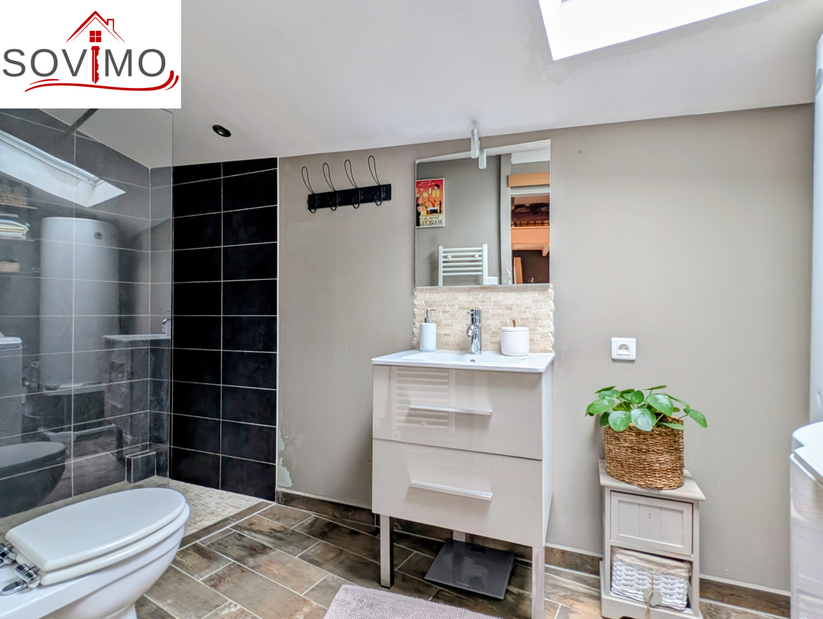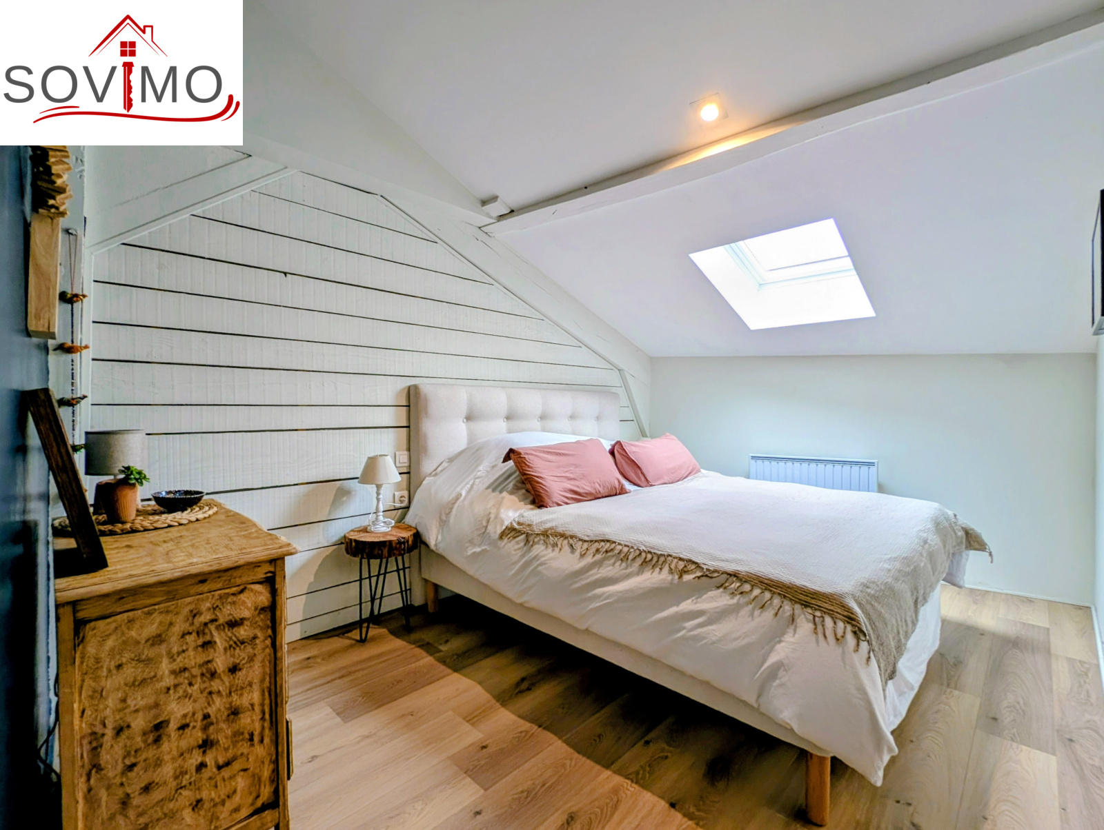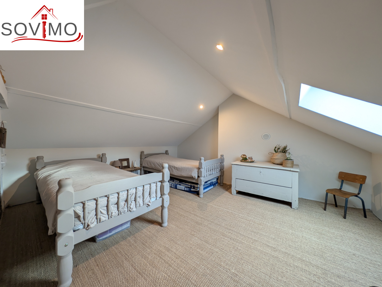 - Rez-de-chaussée : Séjour/salle à manger avec poêle à granulés, ouvert sur cuisine aménagée et équipée, salon (extension) avec poêle à bois, salle d’eau avec WC, 1 chambre mansardée avec dressing.