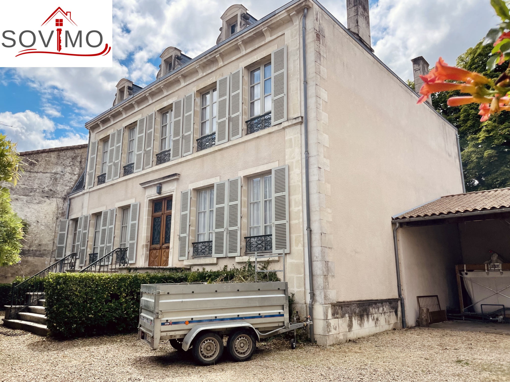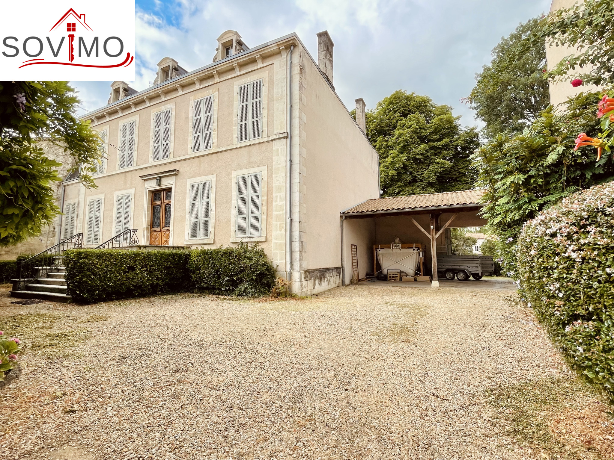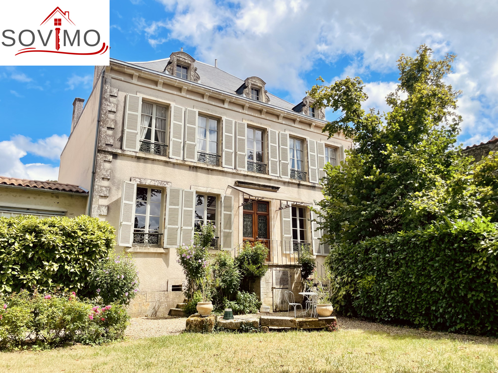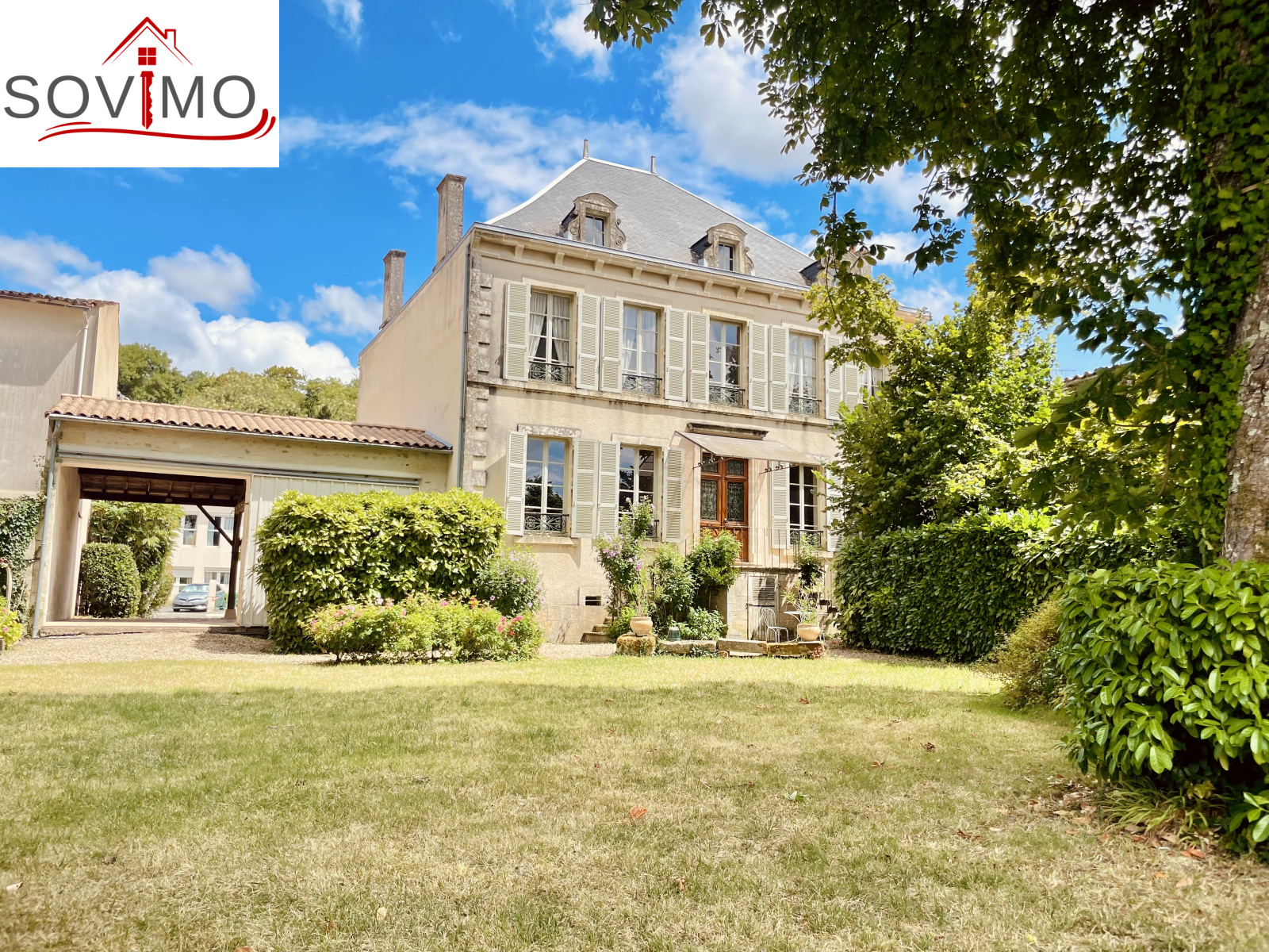 RÉF. 34876 : 349 800 euros HAI, La Mothe St Heray (79), centre ville, belle maison de Maître de 1882, caractère et authenticité, parc agrémenté d'une piscine et annexe, maison à usage d'habitation, 311 m2 env. utilisables, composée au rez de chaussée surélevé : hall d'entrée, cuisine aménagée équipée, salle à manger (cheminée), salon (cheminée), bureau, cabinet de toilette, boudoir, atelier de 13 m2, souillarde de 11 m2, au 1er étage : palier, 2 chambres, salle d'eau, wc, 2nd palier, dressing, 2 chambres avec salle d'eau, 1 chambre avec cabinet de toilette, au 2nd étage : grenier aménageable avec 2 anciennes chambres de bonne de 13 m2 et 8 m2, au sous sol semi enterré : 3 caves 55 m2, 25 m2 et 50 m2 et une chaufferie de 30 m2. Chauf. central granulés, assainissement collectif. Hangar attenant à usage de garage de 50 m2, annexe mitoyenne en pierre avec une pièce au rez de chaussée de 33 m2 et un pièce avec lavabo au 1er étage de 31 m2. Cour attenante, abri de jardin, de 25 m2, piscine enterrée couverte 8x5 avec PAC air/eau, parc arboré attenant avec verger, potager et puits, le tout sur 3925 m2.