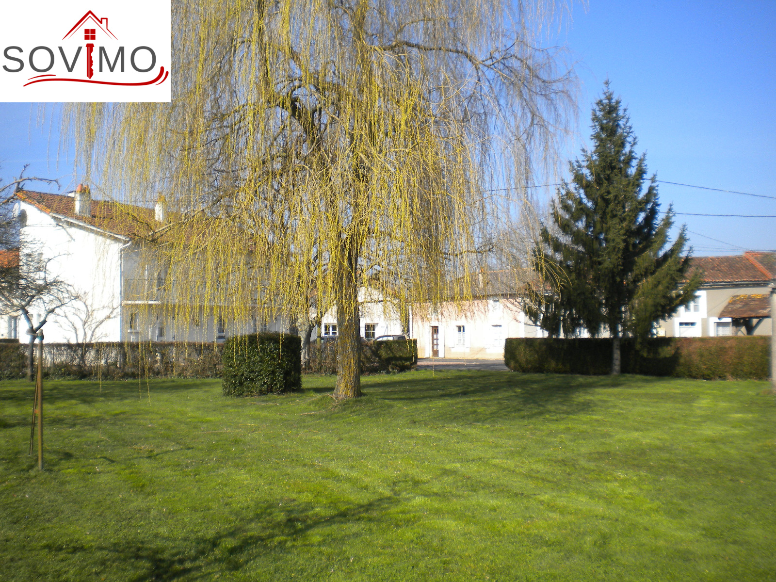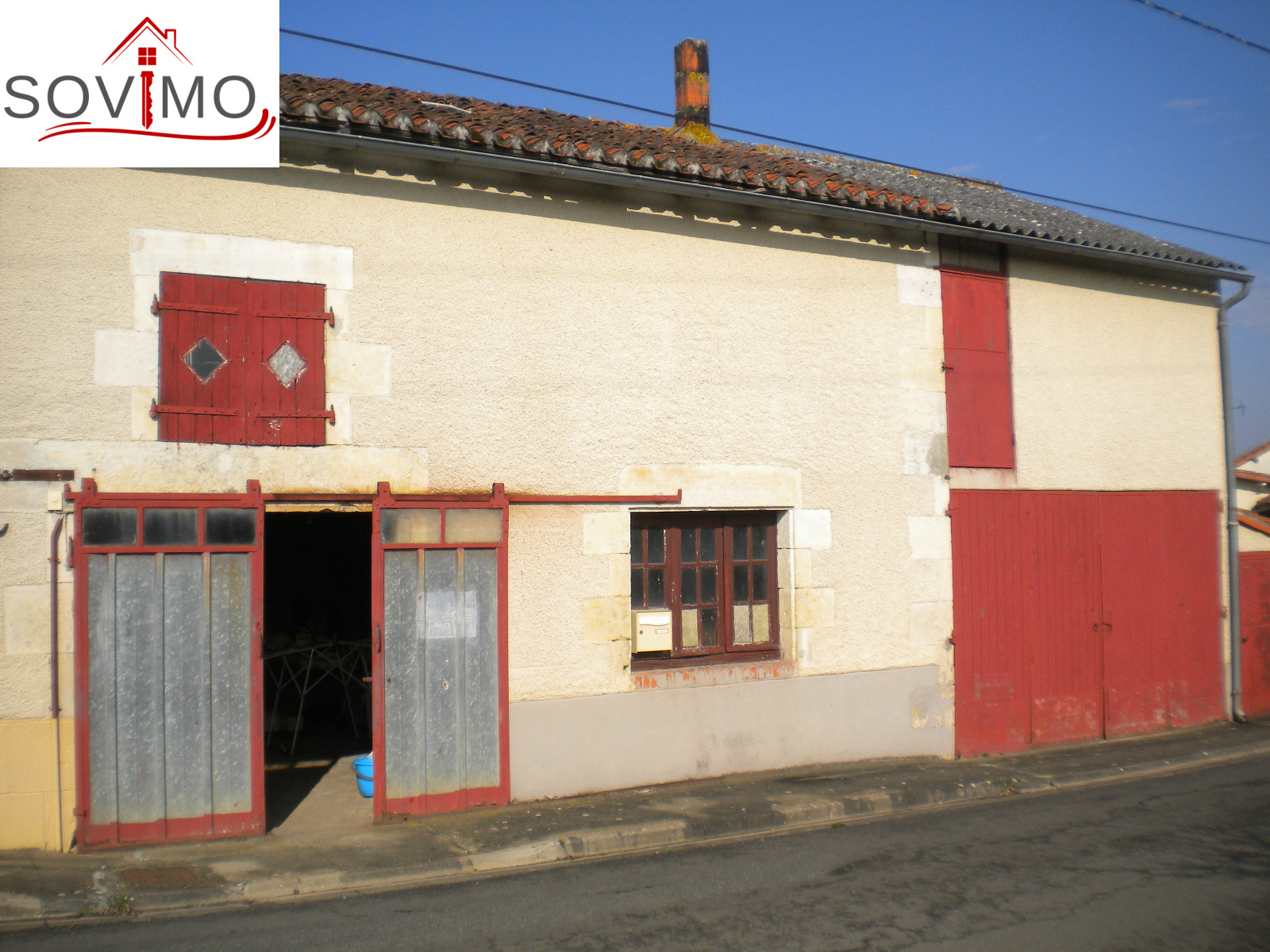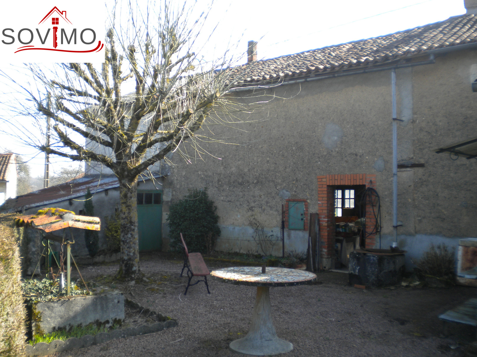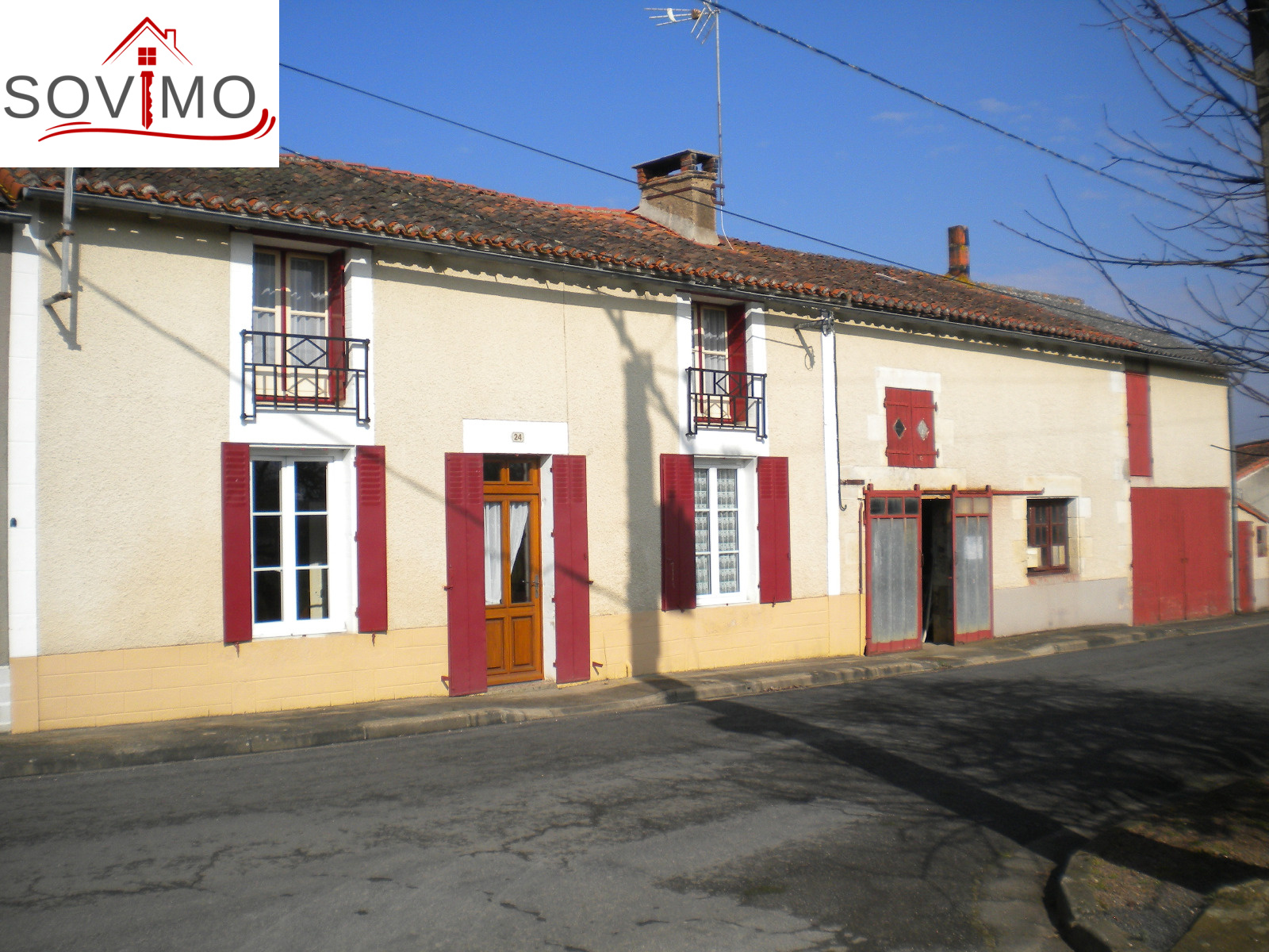 REF. 33502 : 65 700 euros Ag.Incl., Sud Vienne (86), Secteur Isle Jourdain, maison de bourg, mitoyenne sur un côté, 100 m2 env. habitables : cuisine aménagée, salon, séjour, 1 chambre, sd'eau, wc, étage : 3 chambres, wc, chauf. électrique, atelier 36 m2 avec grenier, garage 22 m2 avec grenier, cave, cour attenante, terrain en face constructible avec hangar 75 m2 et divers petits toits sur 1055 m2, tout à l'égout, le tout sur 1340 m2.