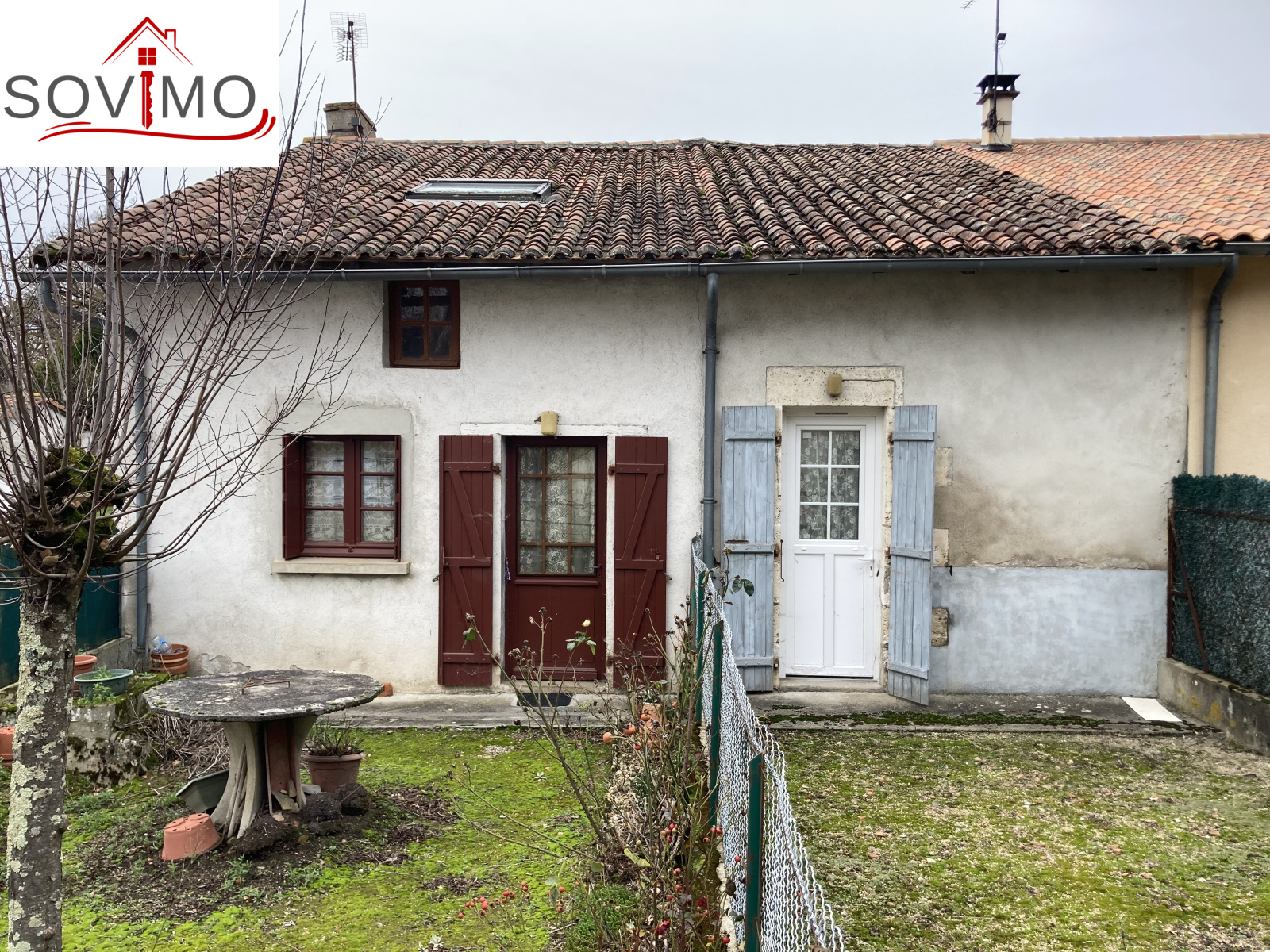 REF. 34565 : 33 000 euros HAI, Lessac (16), proche d'un village avec commerces de proximités, maison de campagne mitoyenne habitable (quelques travaux à prévoir), 88 m² de surface utilisable, composée au rez de chaussée : cuisine/séjour, salon, 1 chambre, salle d'eau, à l'étage :2 chambres, grenier aménageable. Assainissement collectif. Jardinet sur l'arrière de 160 m2. Un garage en face indépendant de 34 m2 env. avec jardin de 143 m2 + un batiment indépendant séparé, à 100 M une parcelle de 2640 m2.