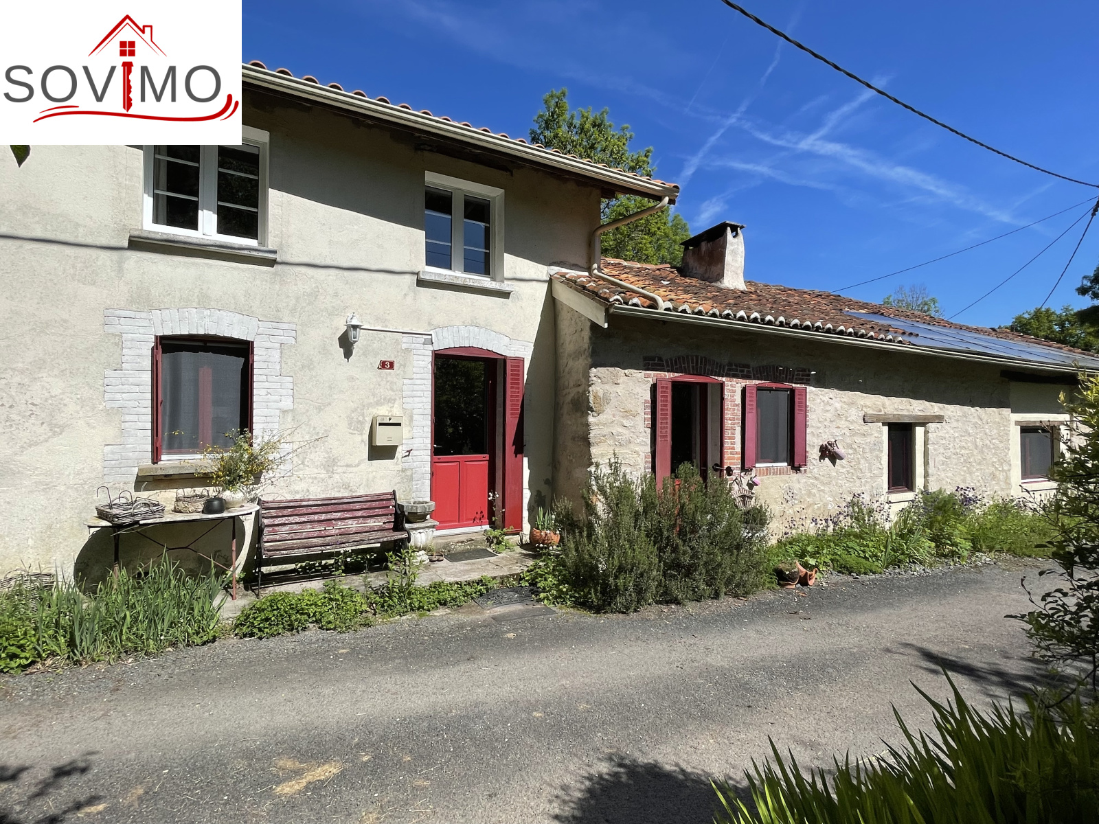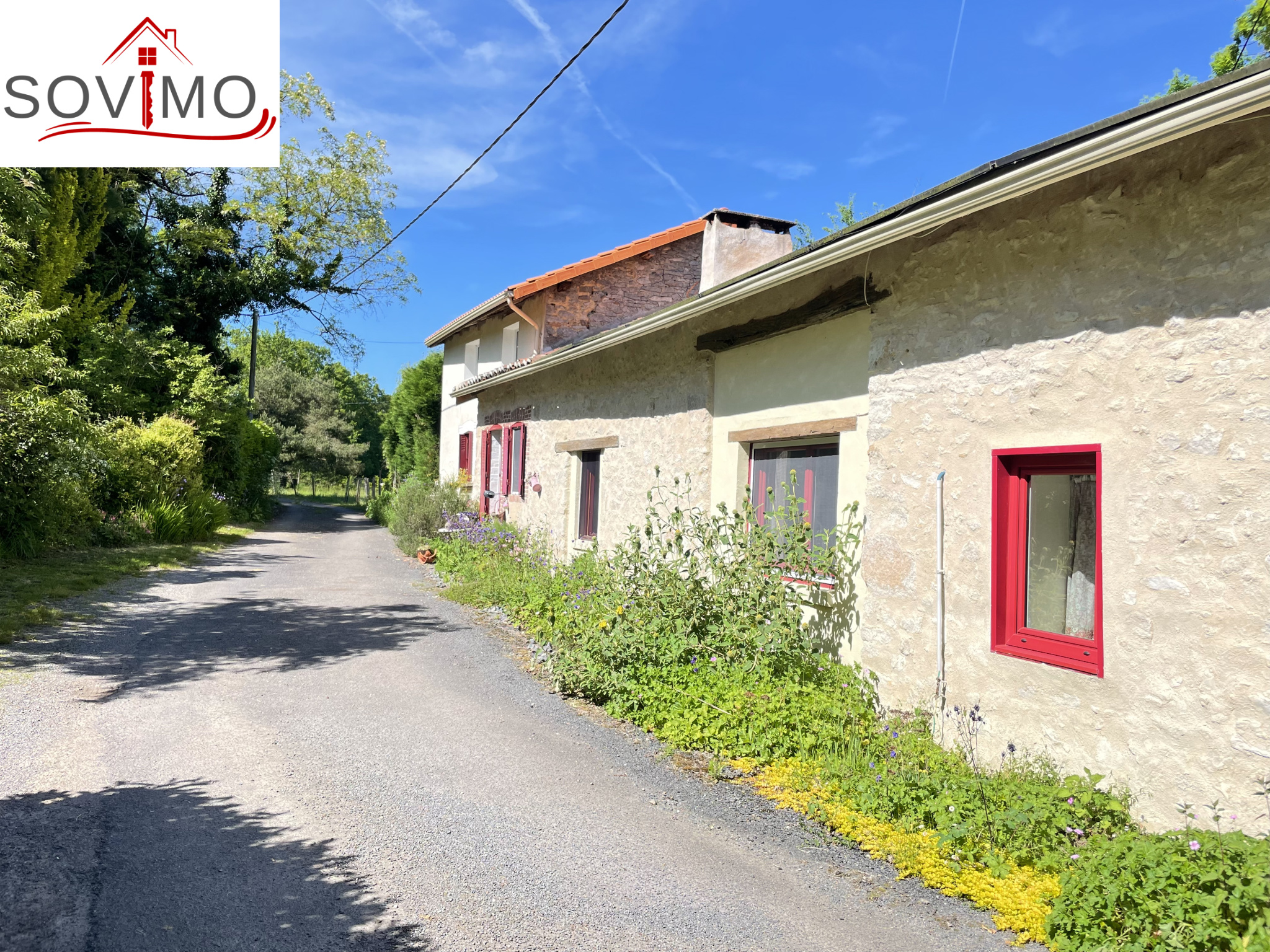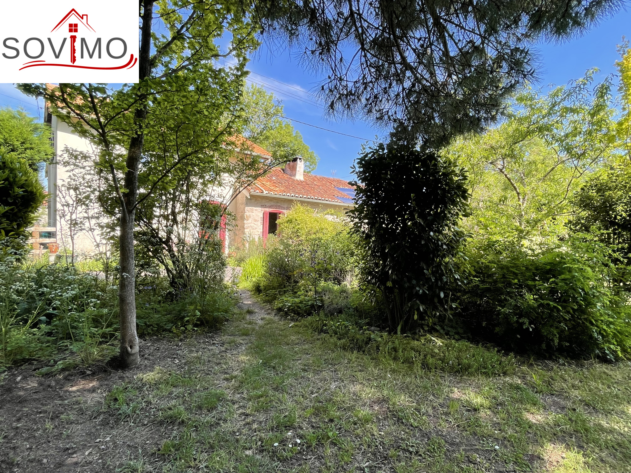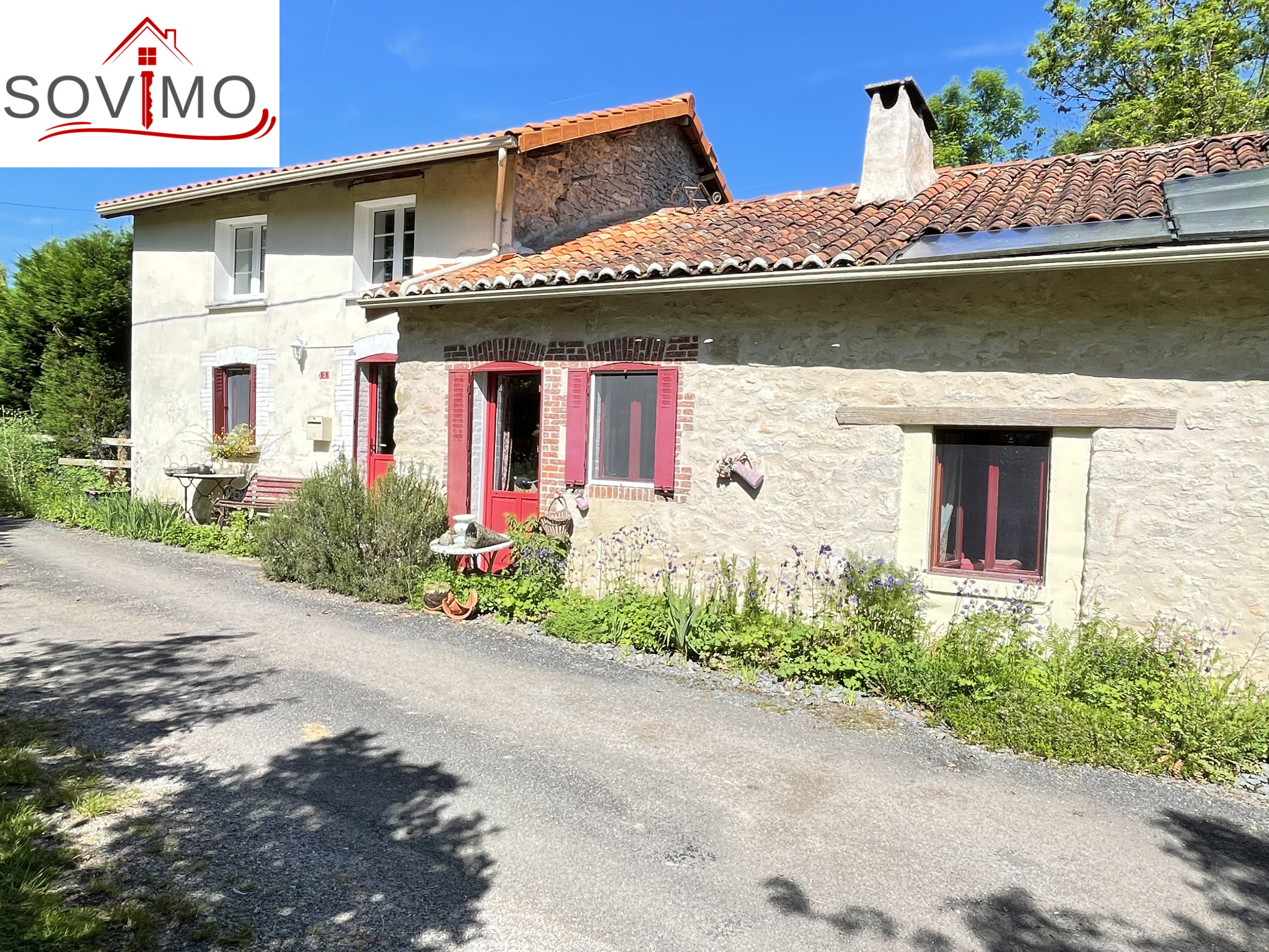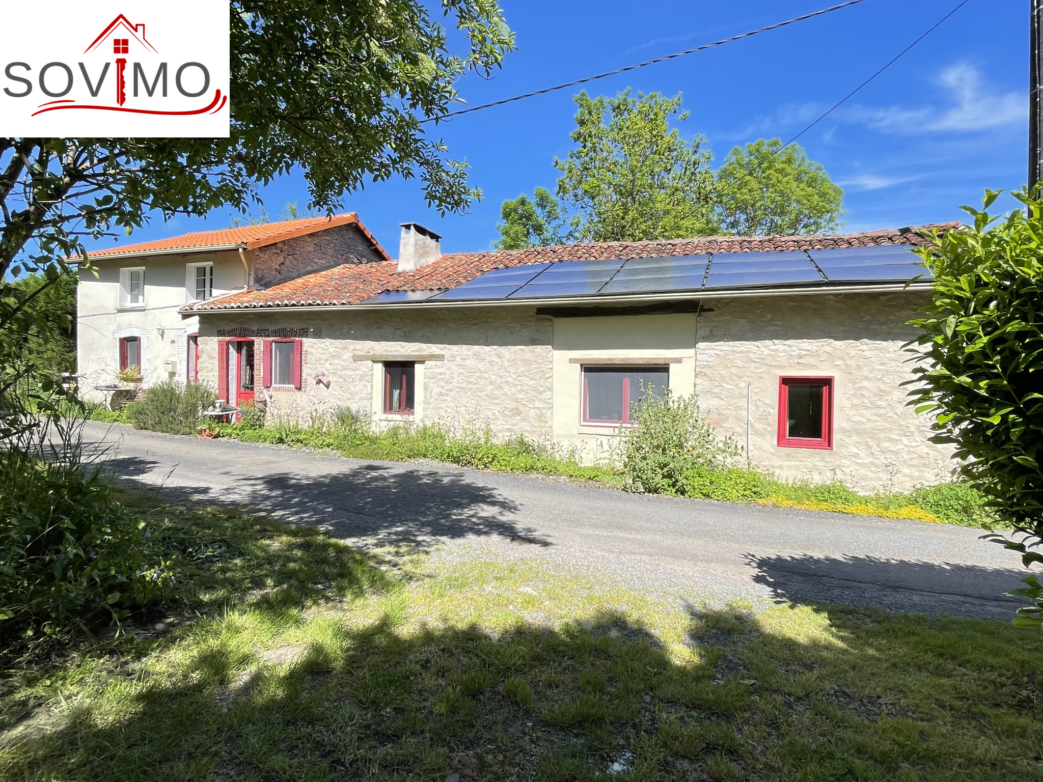 REF. 34614 : 93 500 euros HAI, Manot (16), 9kms de Confolens ville avec tous commerces, dans un hameau, maison de campagne mitoyenne, tout confort, à usage d'habitation, 145 m2 env. utilisables, composée au rez de chaussée : entrée, cuisine aménagée/séjour (cheminée avec cuisinière bois), salon (poêle à bois), dégagements, 2 chambres dont 1 avec salle d'eau/wc, à l'étage : palier, 2 chambres, chauf. électrique, fosse toutes eaux., 16 panneaux solaires. En face séparé : un hangar de 55 m2 + petite mare, puits, diverses parcelles de terre, prés, landes et taillis, le tout sur 1ha 90a 62ca.