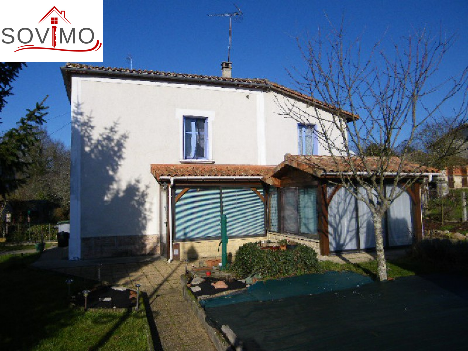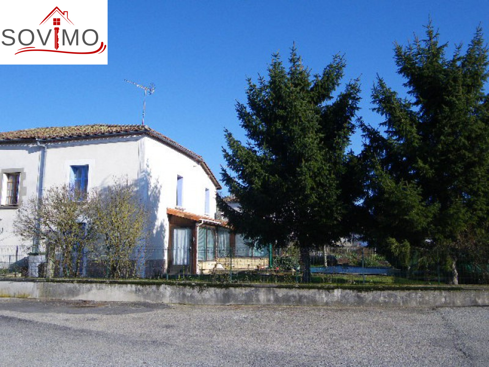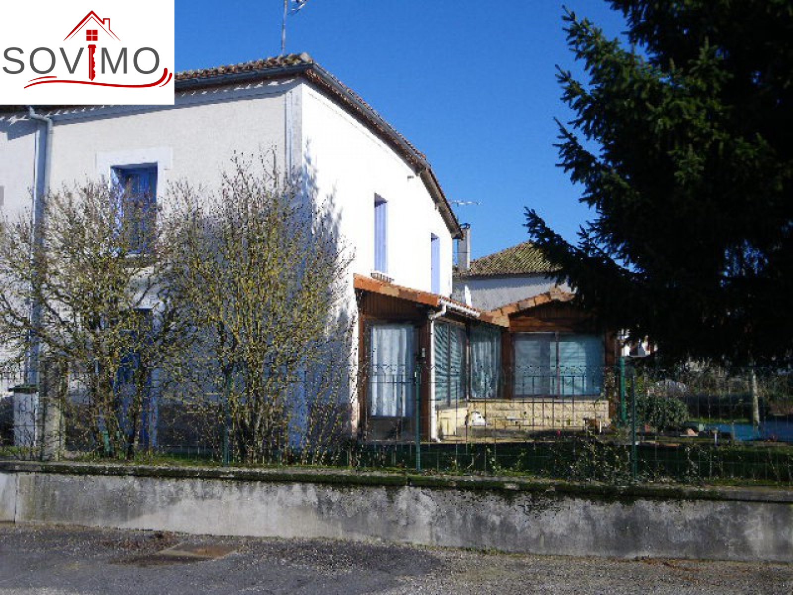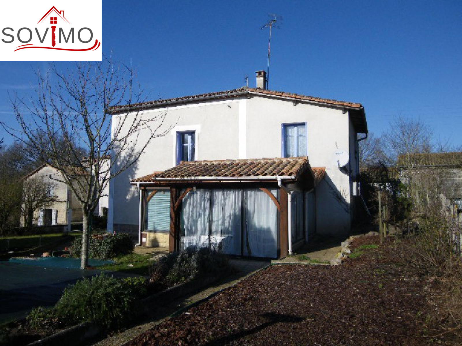 Charente (16), dans bourg avec épicerie/dépôt de pain et sur demande restauration, maison mitoyenne, tout confort, 95 m² env. utilisables : véranda, cuisine aménagée équipée, séjour, buanderie/wc, étage : palier, 3 chambres, salle de bain, wc, chauf.électrique + poele à bois, grenier, garage séparé, tout à l'égout, terrain attenant avec puits, le tout sur 414 m² env.