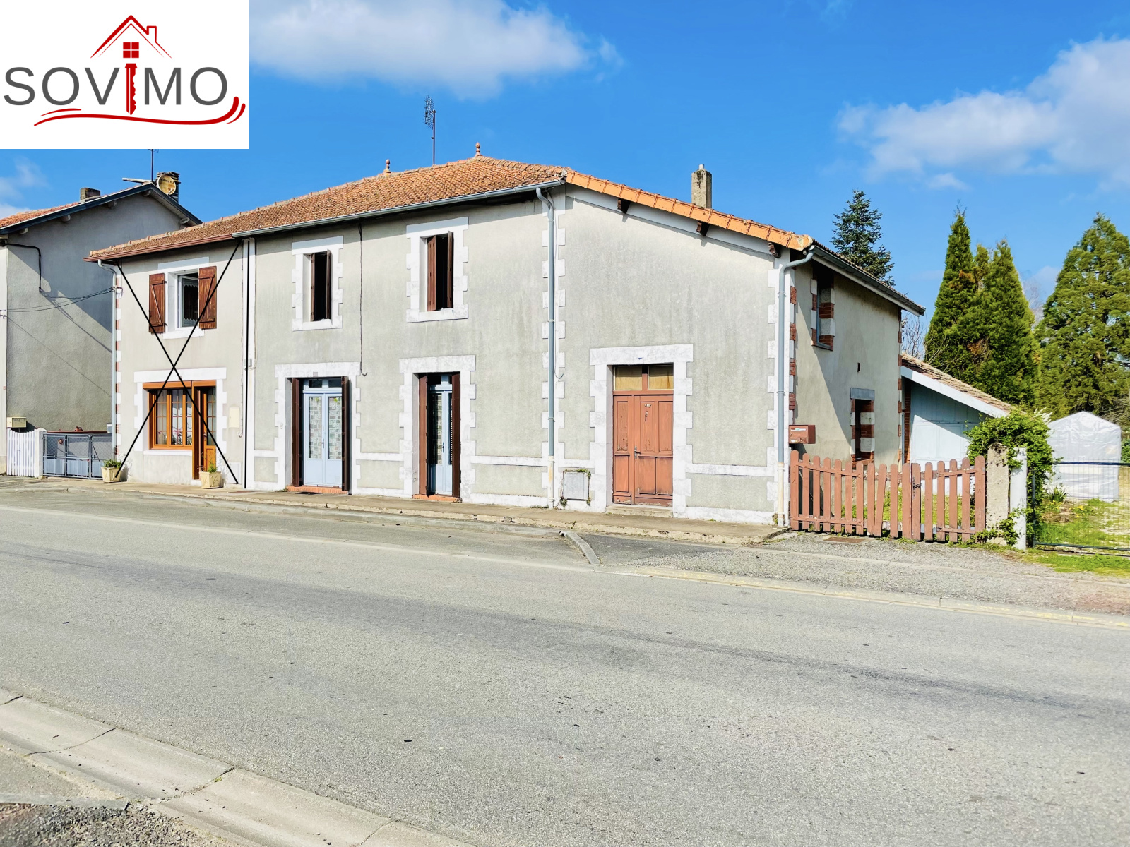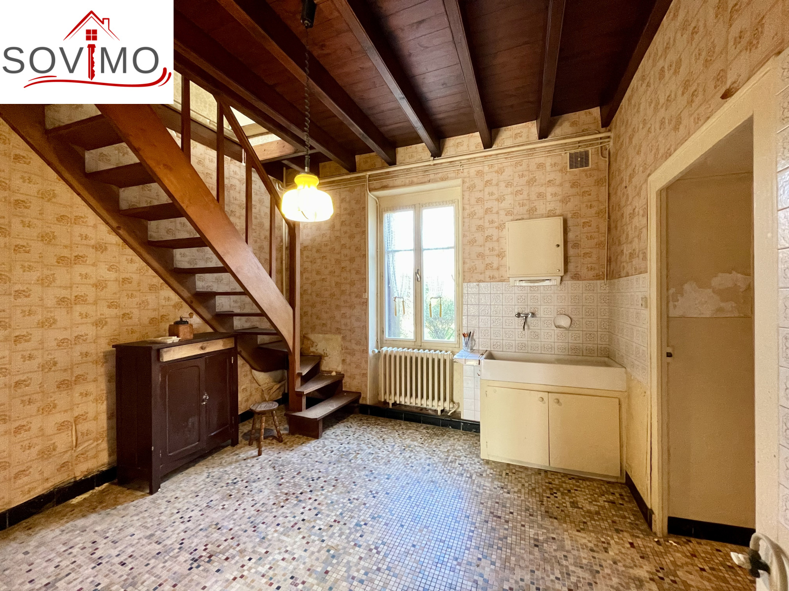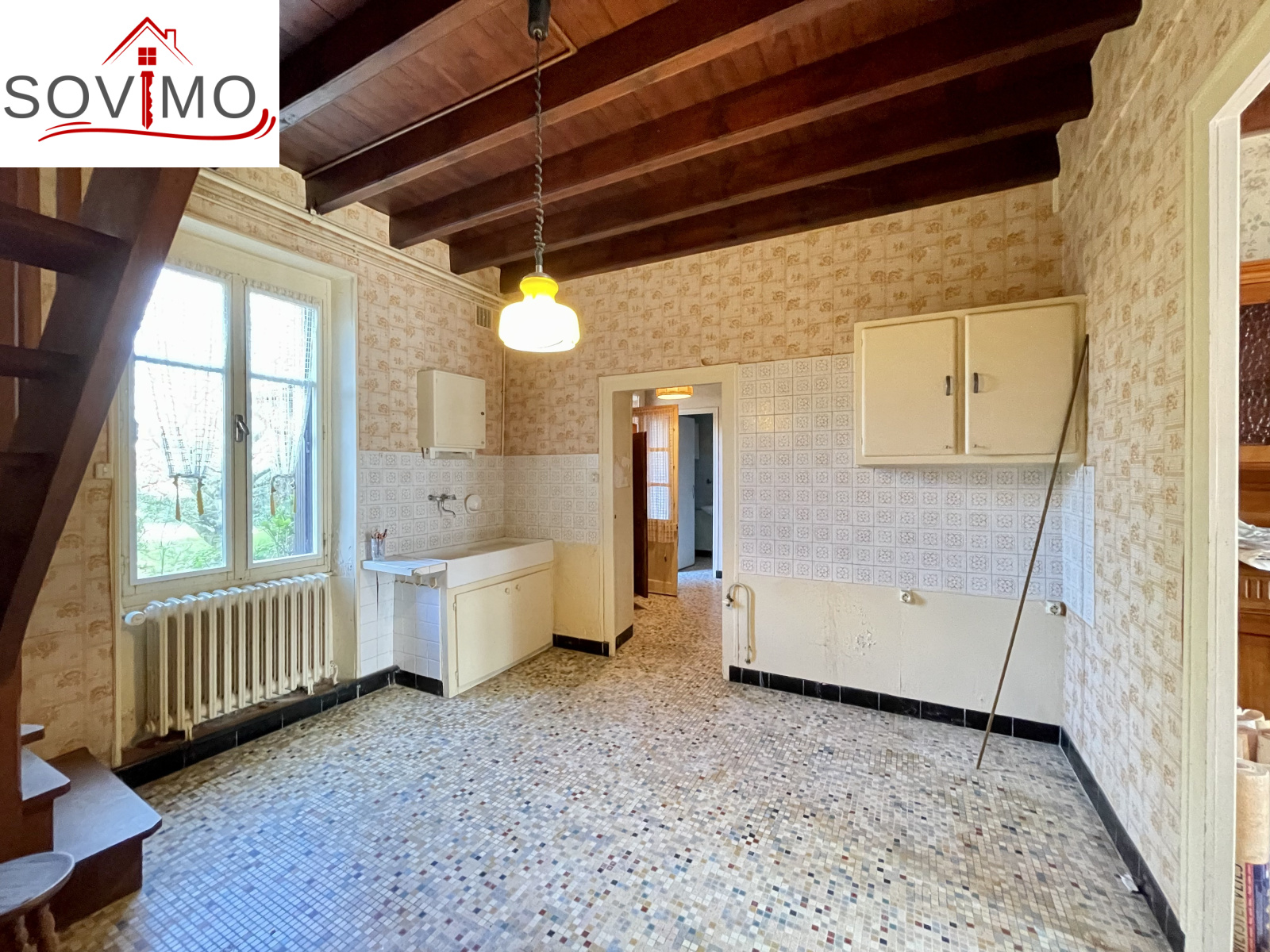 REF. 34729 : 88 000 euros H.A.I, Roumazières (16) petite ville avec tous commerces, maison familiale mitoyenne à rafraichir entièrement, à usage d'habitation, 155,50 m2 env. utilisables, composée au rez de chaussée : cuisine, salon, salle de bain/wc avec accès jardin, 2nde cuisine, salle à manger, dégagement, salle d'eau, cellier/chaufferie/wc avec accès grenier mansardé de 23,50 m2, à l'étage : 2 paliers, 4 chambres dont une avec wc. Chauffage central gaz, assainissement collectif. Appentis attenant de 11 m2 avec ancien wc. Dépendance avec cave de 7 m2. Terrasse couverte de 14 m2, garage de 12 m2. Jardin attenant arboré non clos, le tout sur 806 m2.