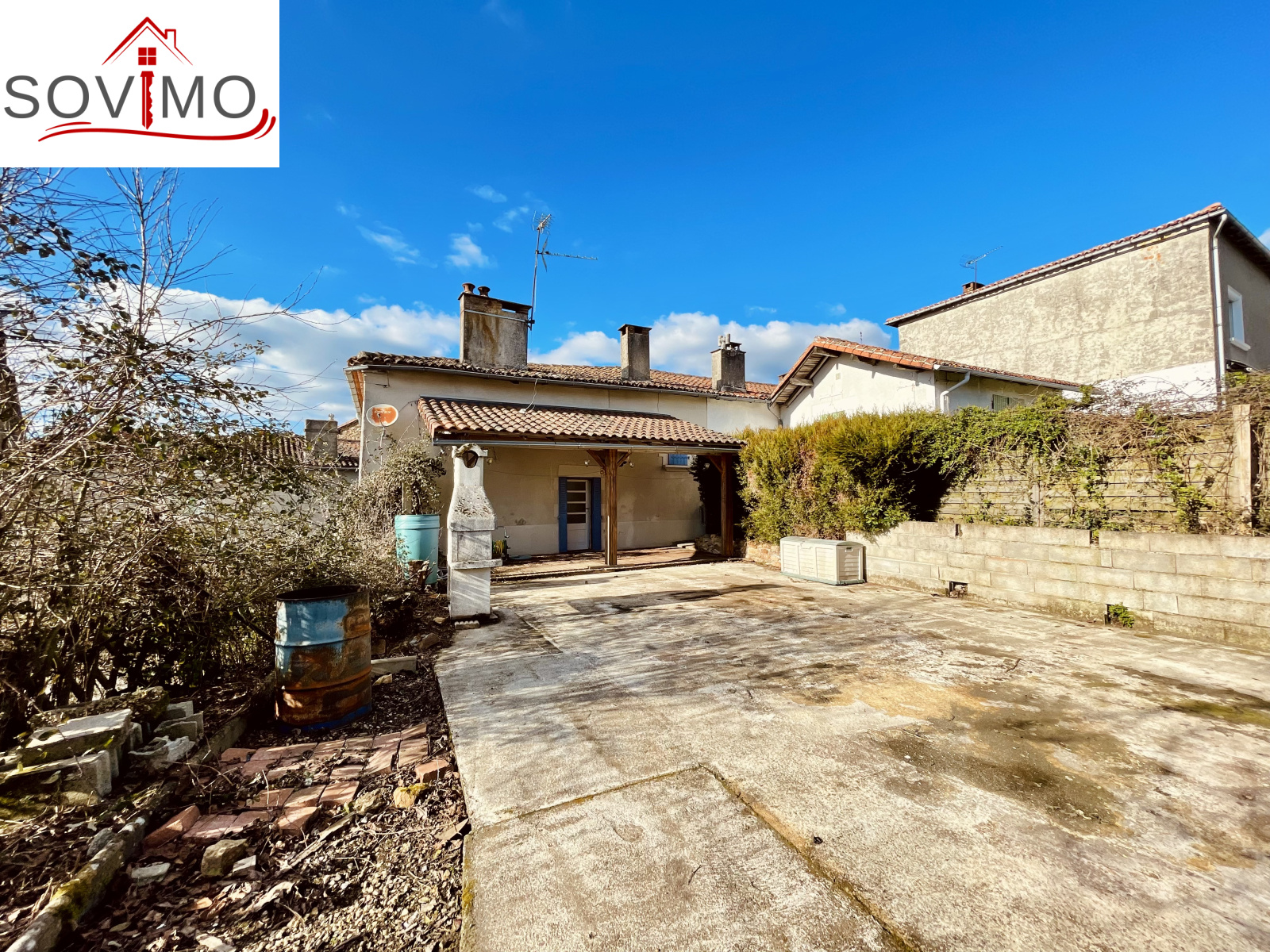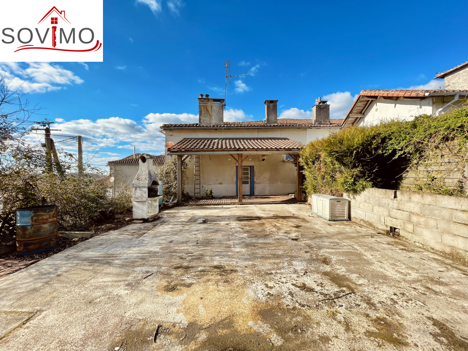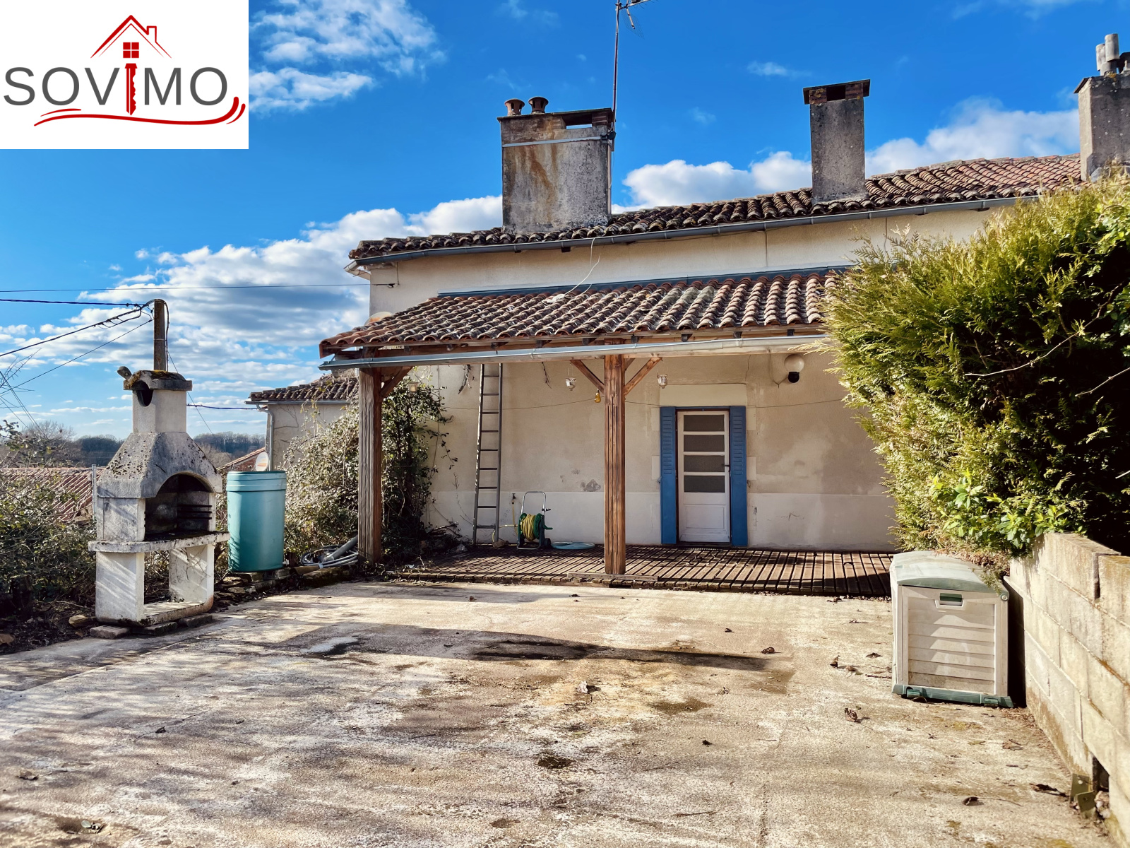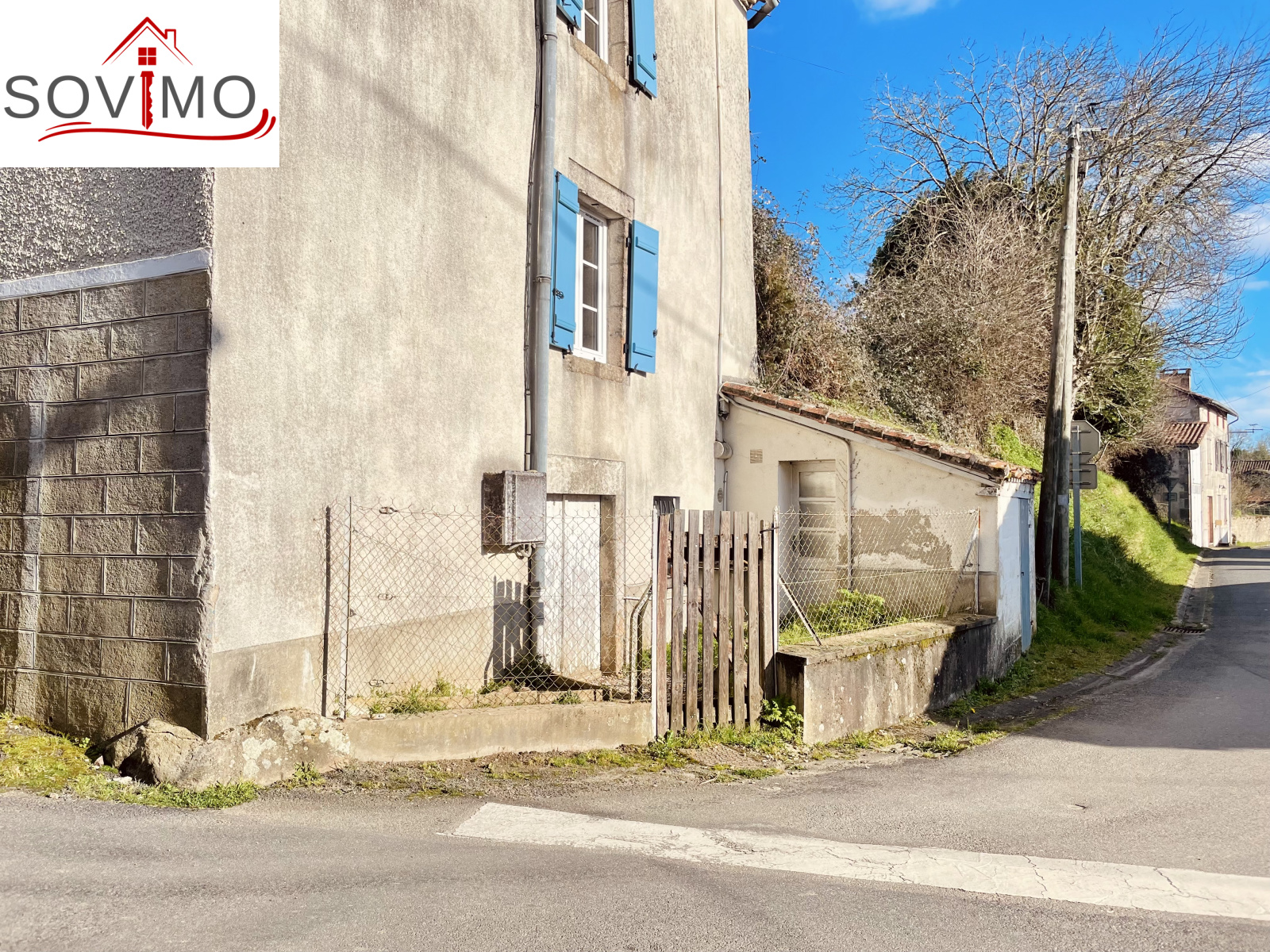 REF. 34708 : 68 200 euros HAI, Saint Christophe (16), au centre bourg avec commerces, maison de village mitoyenne, à usage d'habitation, 90 m2 env. utilisables, composée au rez de chaussée : cave de 20 m2, ancienne salle d'eau de 4 m2, au rez de chaussée surélevé : cuisine aménagée, salon/salle à manger (poêle à bois), dégagement, salle d'eau/wc, à l'étage : palier, 3 chambres, salle d'eau/wc avec accès comble. Chauf. électrique, assainissement collectif. Terrasse en bois avec appentis, cour/jardin avec petit abri sur 290 m2. En face ancienne maison à usage de garage/stockage de 45 m2 avec grenier au dessus. Le tout sur 335 m2.